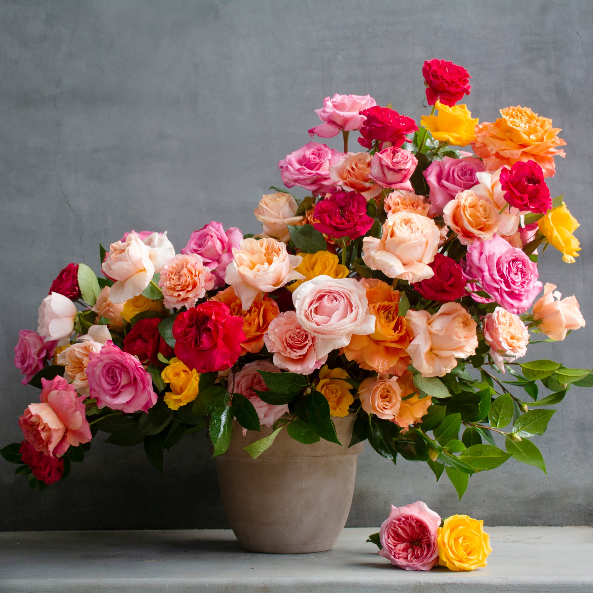 Our timeless rose garden is designed with a mixture of regular and garden roses. The garden rose selection includes the uniquely textured Ruffled Princess Crown, the gradient-toned Mayra's Peach, the soft and creamy Ohara, the vibrant Mayra's Rose Bright, as well as classic yellow roses and blooming shimmering roses. This opulent composition stands at a height of 26 inches and spans 29 inches in width.