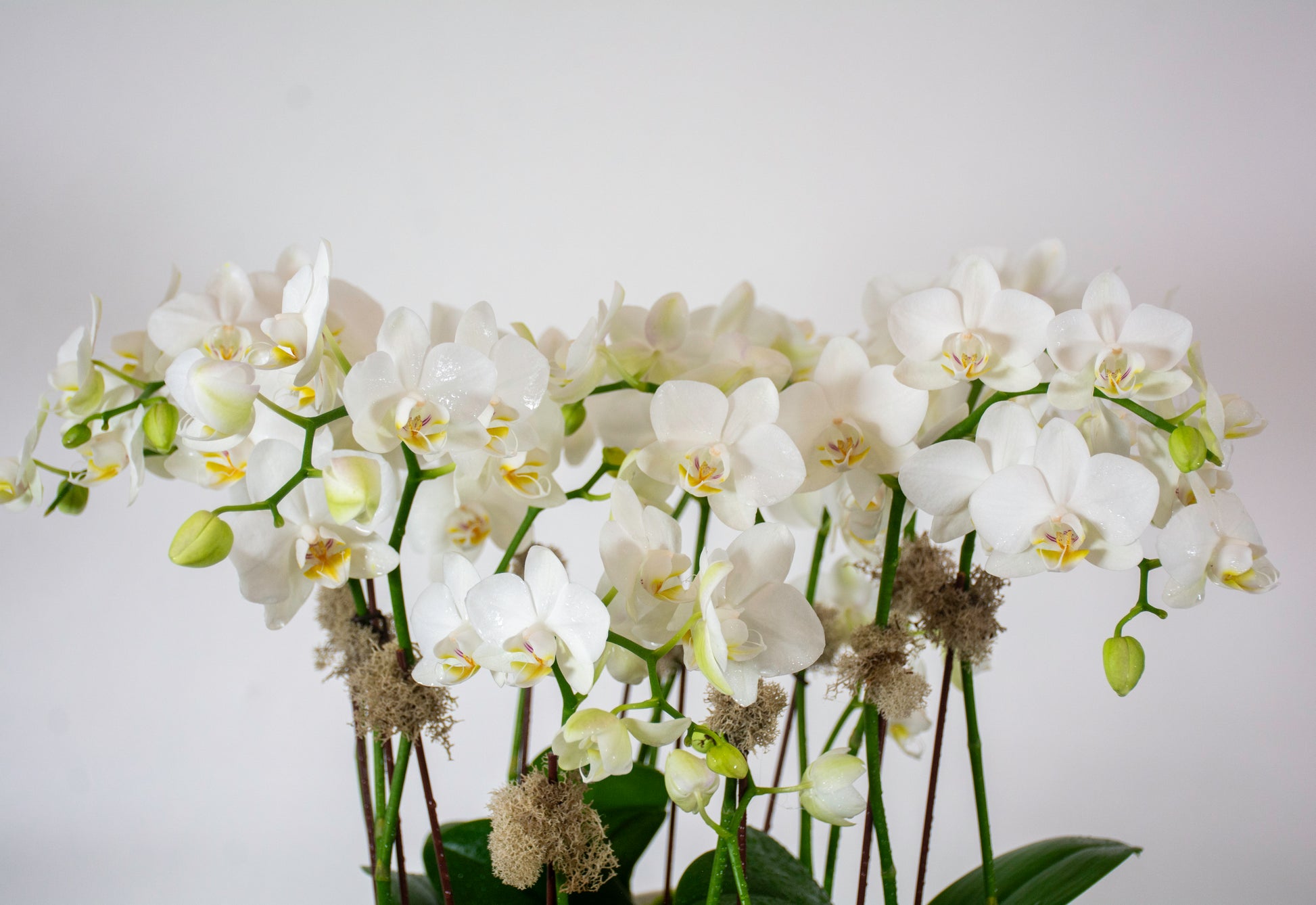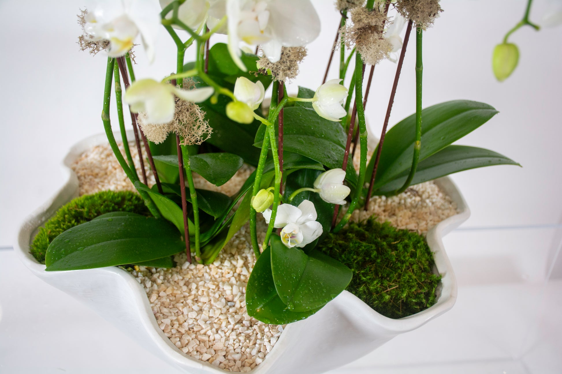 At the heart of this botanical symphony are pristine white Phalaenopsis orchids, with their delicate blooms creating a captivating focal point. Rich emerald foliage frames the base, completing this harmonious composition where nature's artistry meets sophisticated design.