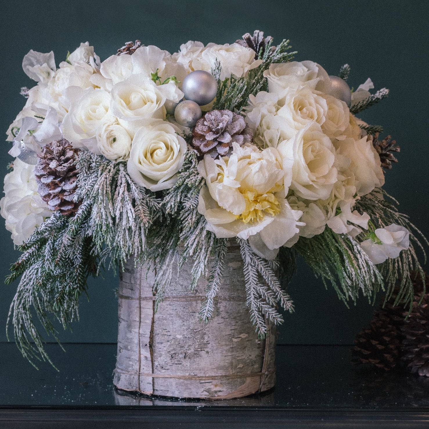 A faux-snow covered vision, as stunning as a frosted winter landscape. White peonies in full bloom rest alongside white sweet peas, pristine white tibet roses, and delicate white ranunculus. Armadillo pine and micro noble fir add an additional layer of wild beauty atop an 8”x8” wide birch covered cylinder vase.