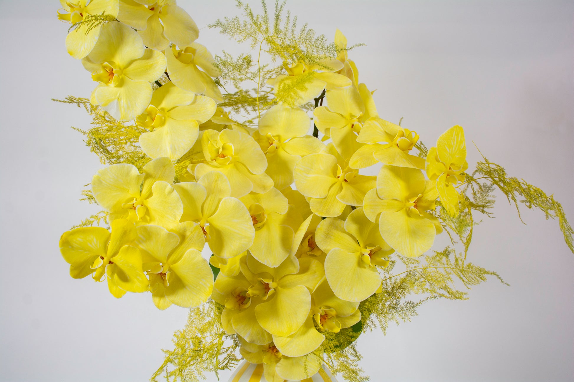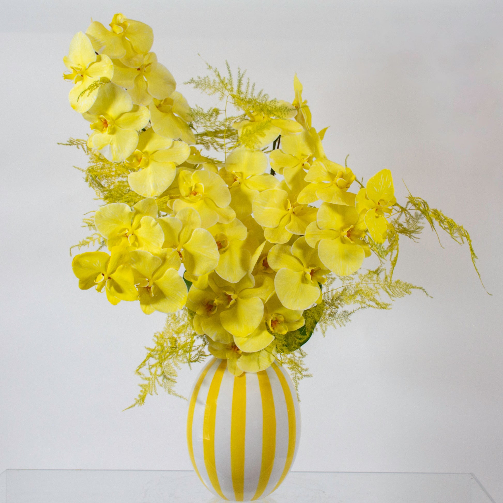 Il Pellicano is an all-yellow bright Phalaenopsis orchid design adorned with yellow-green Ming fern. Monstera leaves are carefully placed to support the back of the arrangement. The full design is held in a white and yellow striped ceramic, high-gloss vase.
