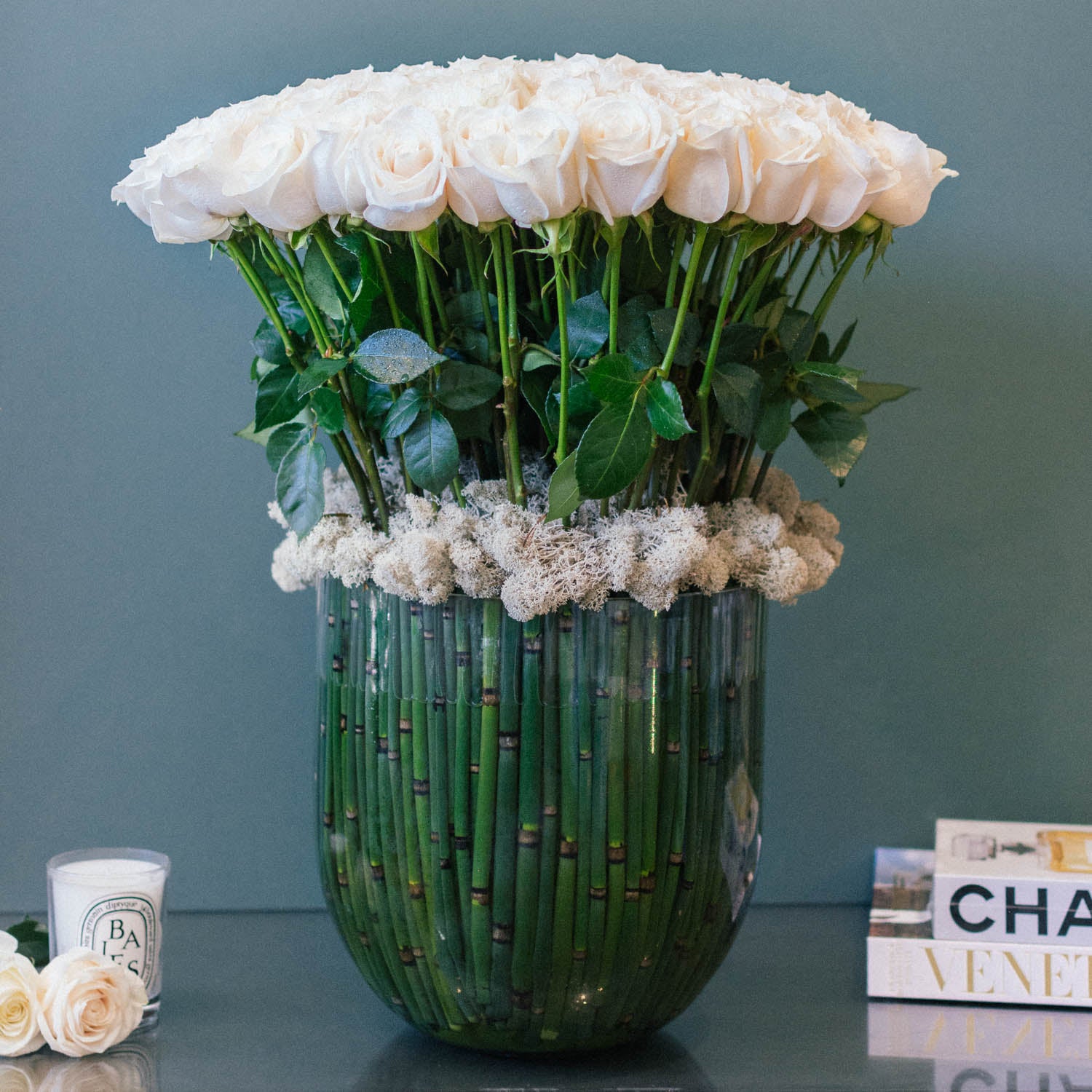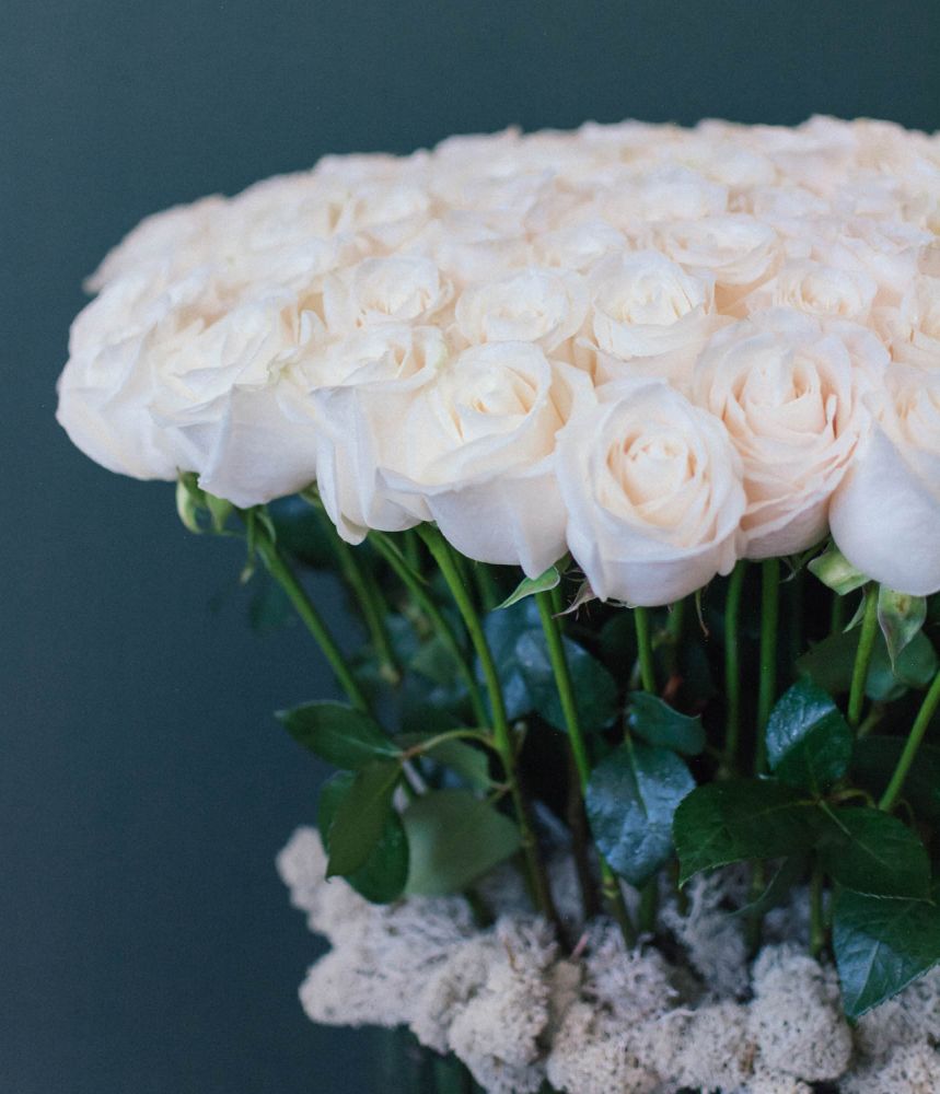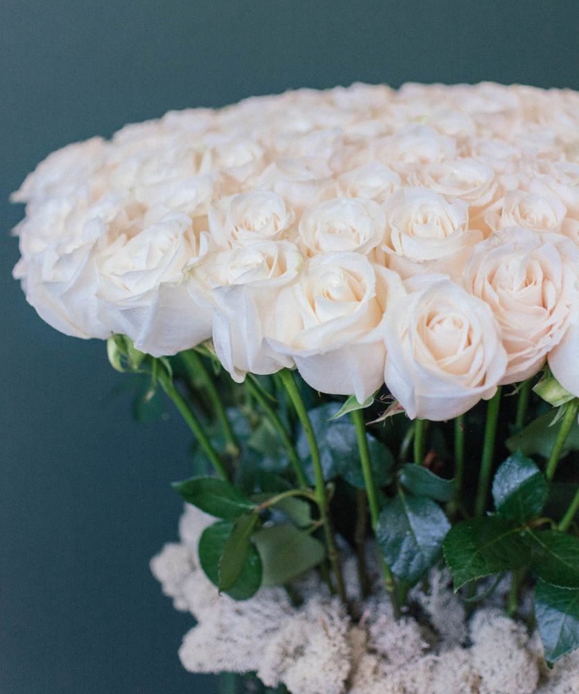 One Hundred pristine ivory roses stand tall gathered atop a bed of creamy white reindeer moss, all resting within an 11" tall by 11" wide cylinder glass vase meticulously lined with horsetail. This breathtaking design stands at 23" tall and 21" wide overall. ***THE VASE IN THIS ARRANGEMENT IS NO LONGER AVAILABLE. WE WILL BE SUBSTITUTING A 11-12" WIDTH CYLINDER VASE INSTEAD***