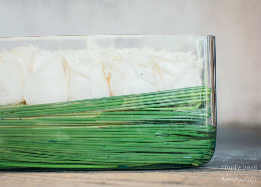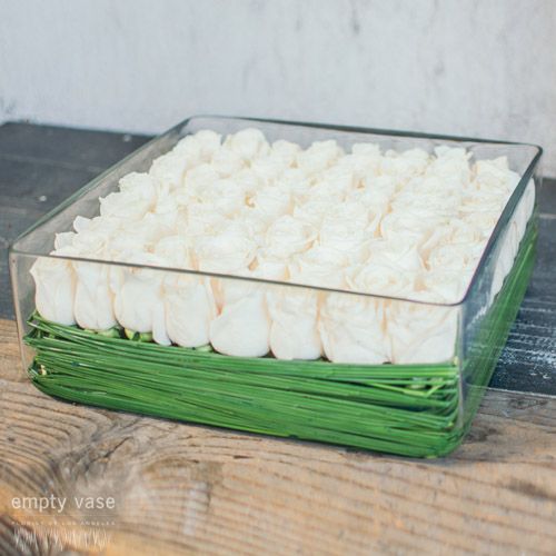 Highly revered for its timeless beauty, the rose is among the most iconic flowers in the world. This arrangement features an elegant array of up to 50 white roses resting in a 12”x12”x6” low glass vase lined with vibrant green middolina wire.