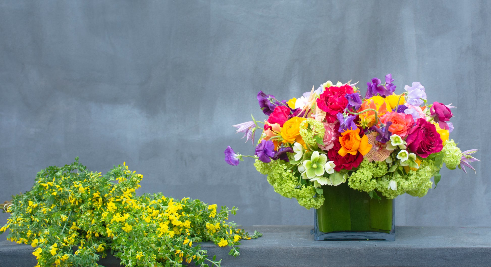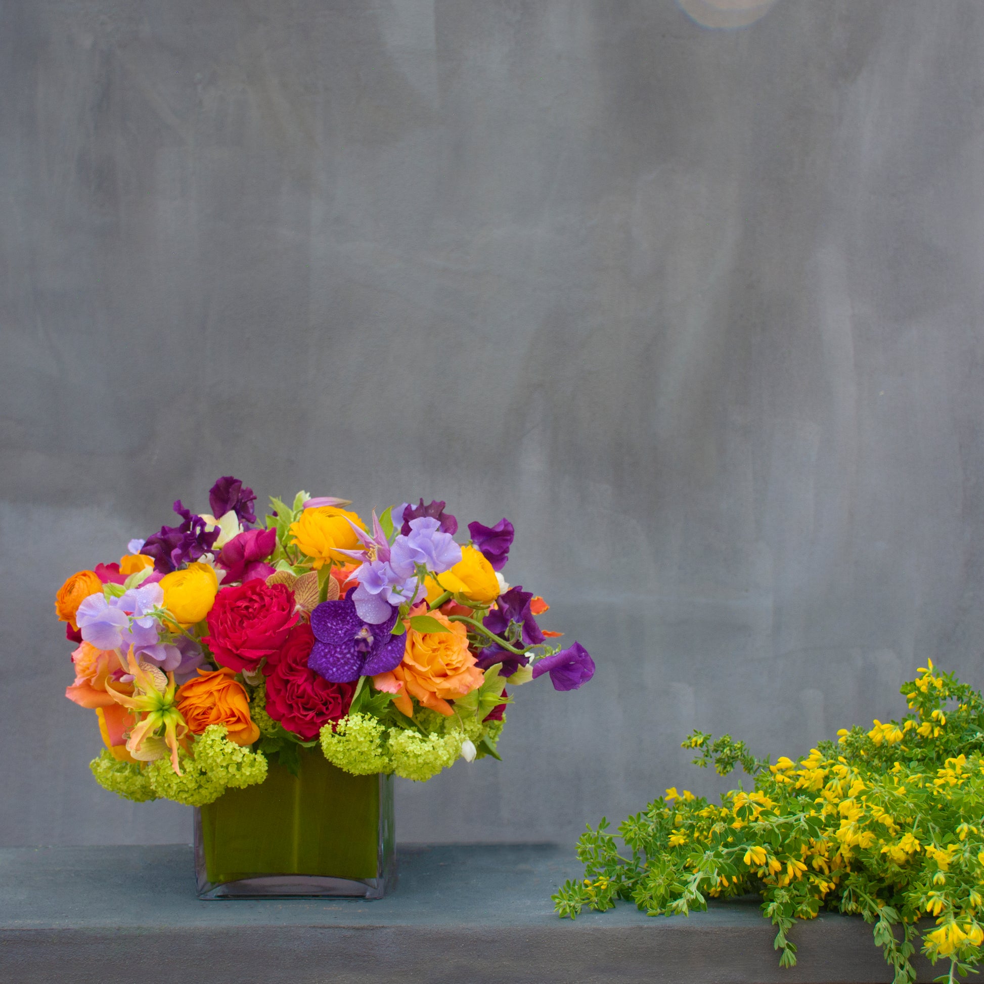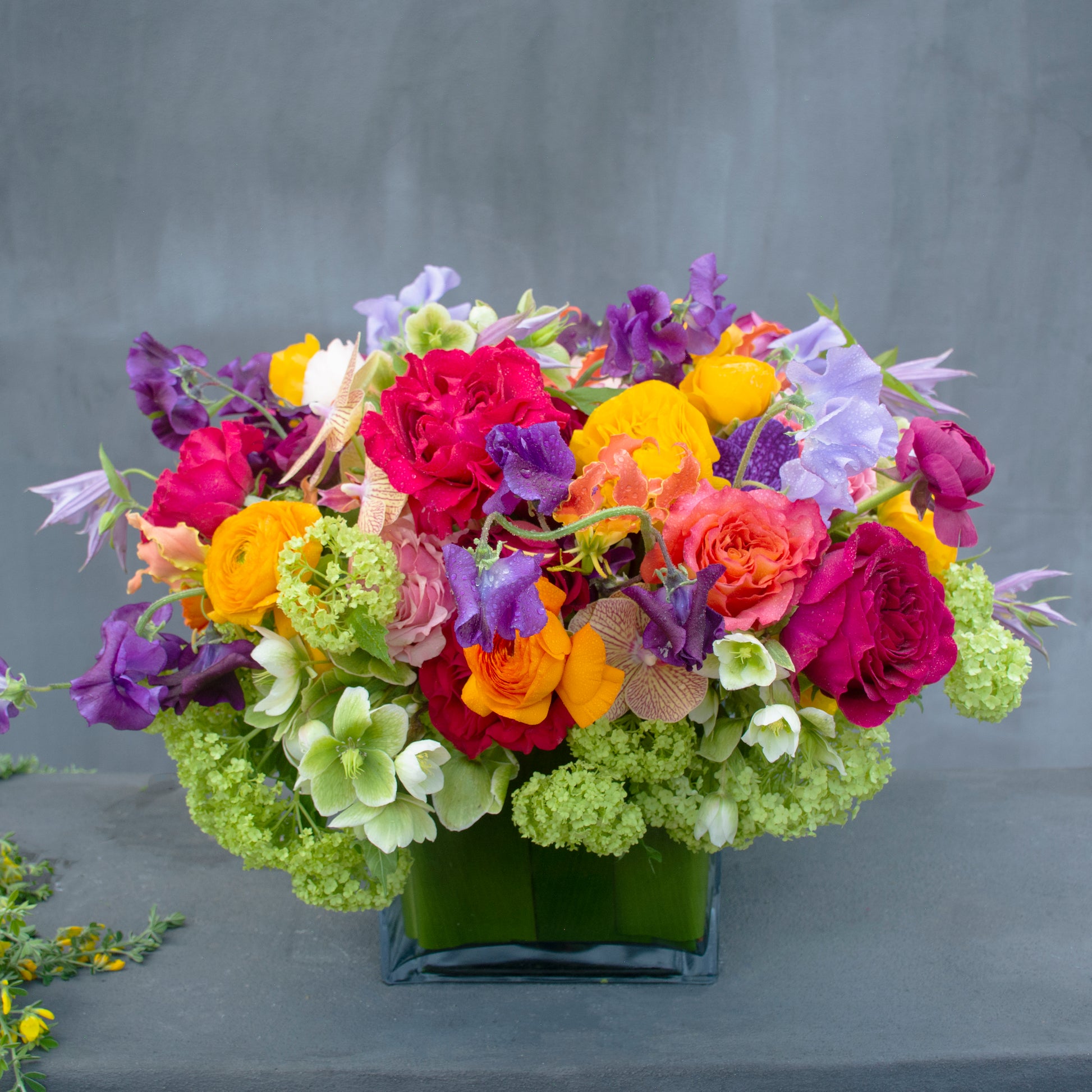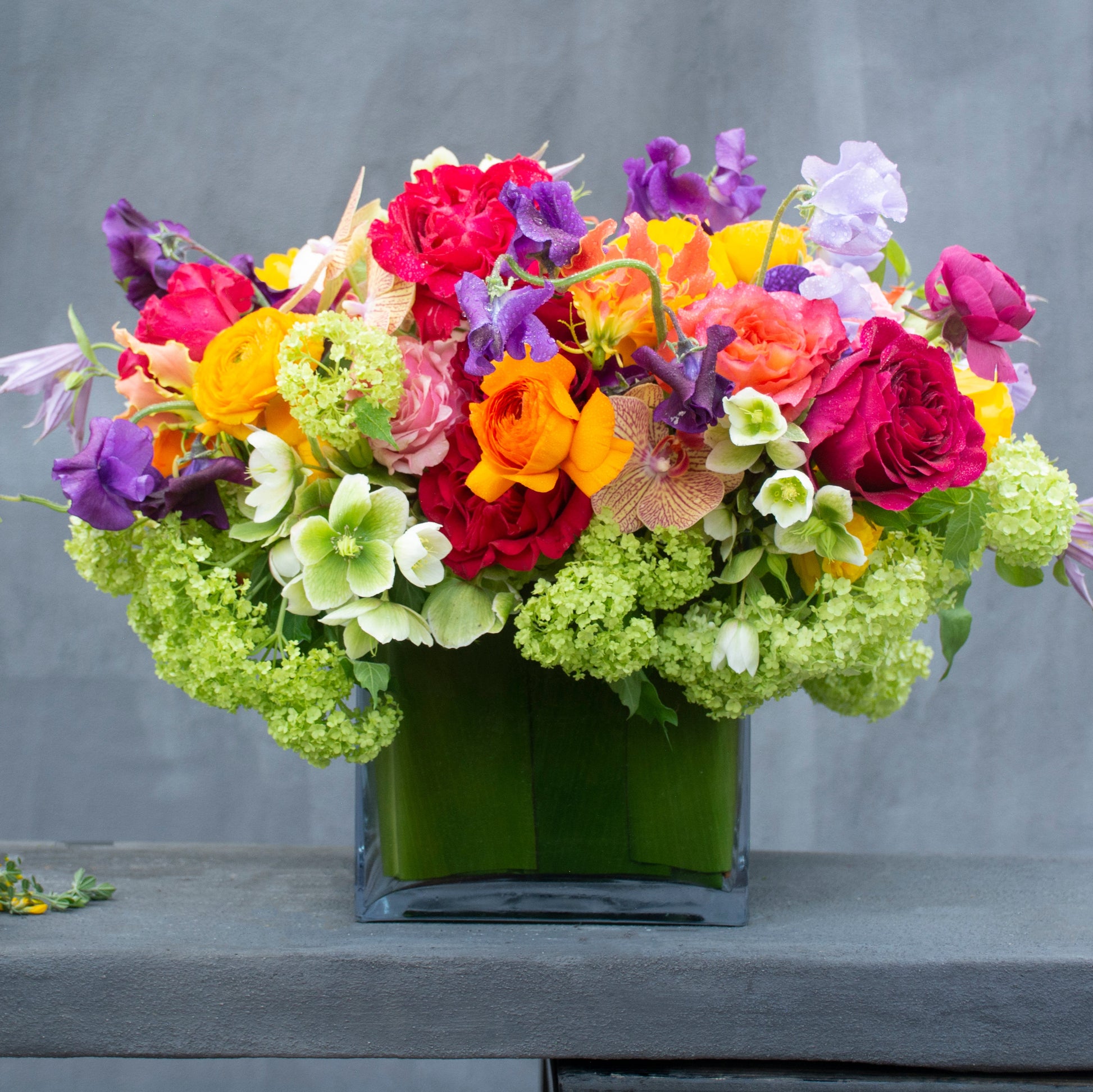 A celebration of color and elegance, Le Jardin du Printemps captures the essence of spring in full bloom. This exquisite arrangement overflows with lush green viburnum and delicate winterrose, creating a fresh and vibrant foundation. Cascading sweet peas in shades of purple and lavender add softness, while striking orange gloriosa and lavender clematis lend an air of wild beauty. Bright orange and golden yellow ranunculus bring warmth and radiance, perfectly paired with a stunning medley of pink, peach, and hot pink roses for a touch of romance. Accented with the exotic beauty of golden treasure orchids, this masterpiece is artfully designed in a sleek, leaf-lined square glass vase. Bursting with rich hues and delicate textures, Le Jardin du Printemps is a timeless expression of joy.