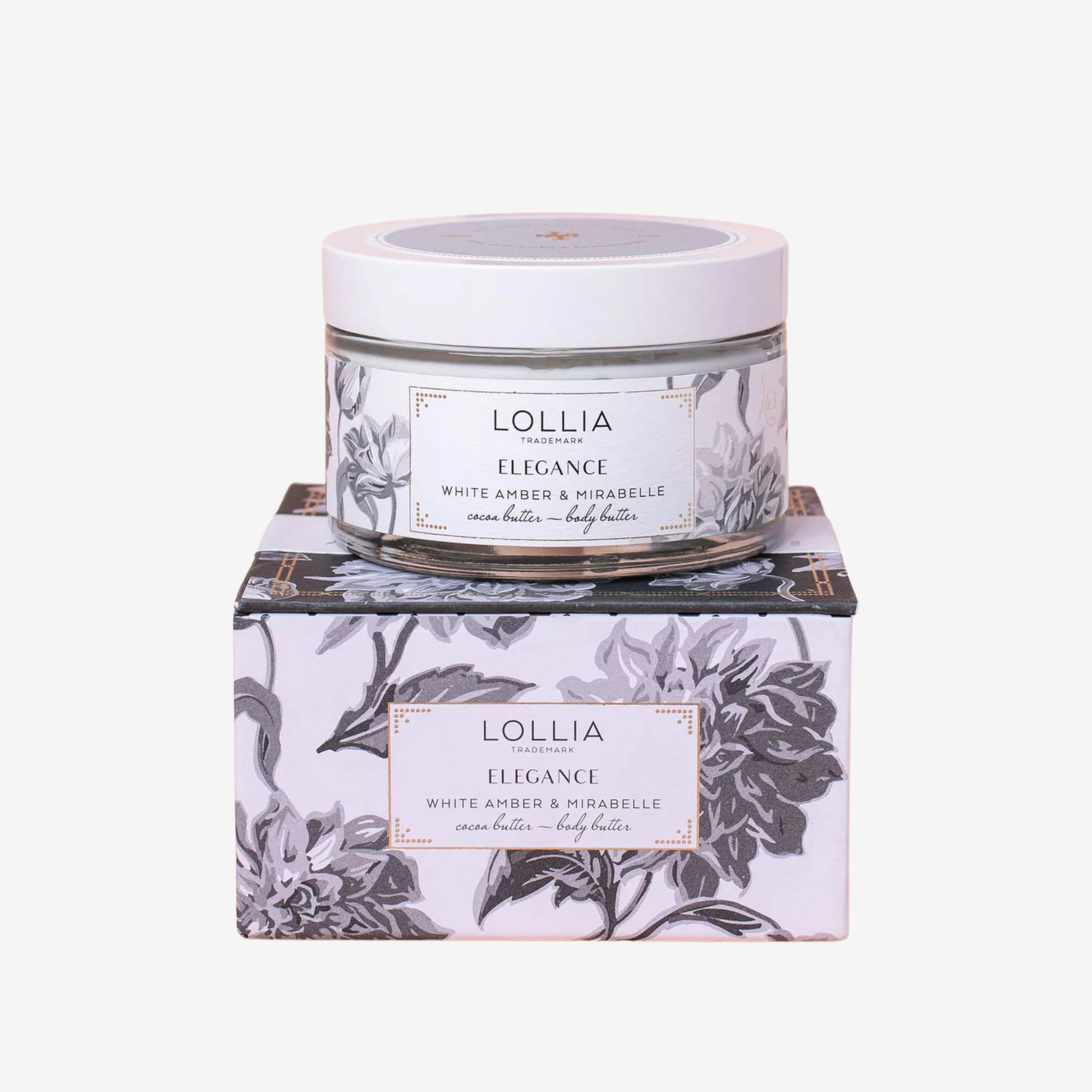 Discover moisture-rich bliss in Lollia’s Elegance Body Butter. Ultra-nourishing and richly comforting, Aloe and Shea Butter envelop your body in lush hydration as Cocoa Butter and Avocado Oil restore radiance. Delicate floral infusions of White Amber & Mirabelle leave skin delightfully scented.