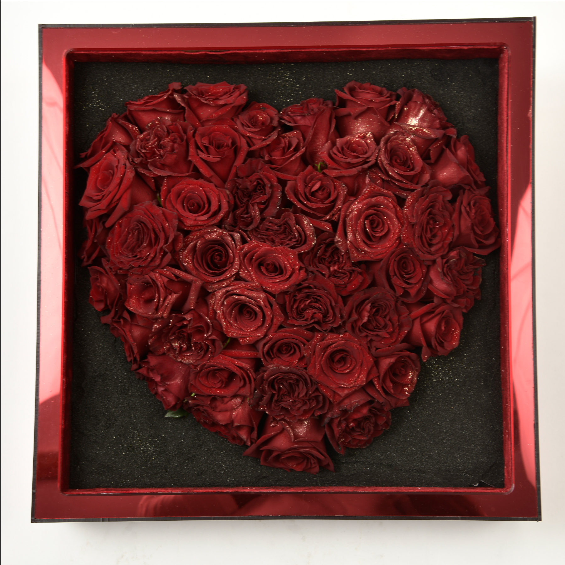 Presenting our exclusive limited edition Red Mirrored Box – a masterpiece crafted with precision. Immerse yourself in the allure of this stunning personalized mirror box, featuring a luxurious red plexi-glass finish. Within, discover an exquisite heart of deep red roses delicately cradled amid ebony sand, creating a captivating visual experience. Measuring a generous 16" x 16" with a height of 6", this reusable box is not only a striking presentation but also a versatile keepsake. Elevating the luxury, it comes accompanied by a sumptuous red felt lining, adding an extra layer of opulence to this unique and unforgettable creation.