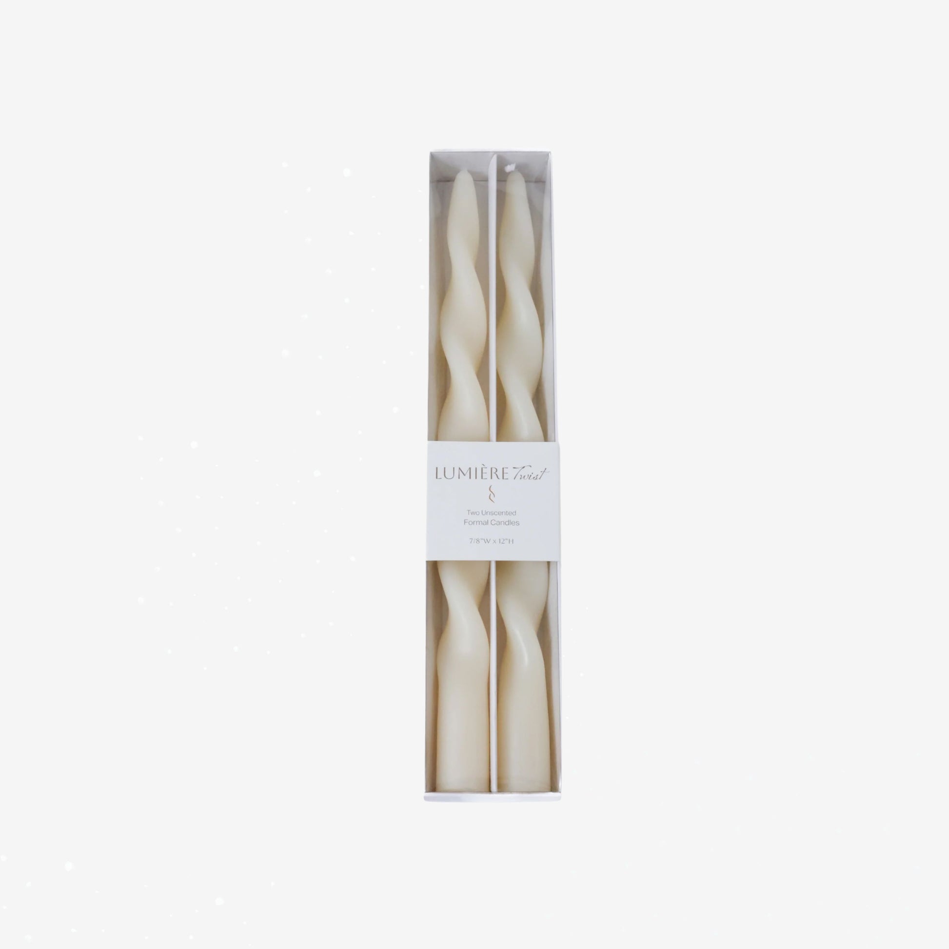 Elevate your table with the sculptural elegance of the Lumière Twist Formal Taper Candles. Expertly crafted from unscented paraffin wax, each candle features a graceful spiral silhouette that adds a touch of refined drama to any setting. Whether used for formal dinners, seasonal celebrations, or everyday ambiance, these tapers offer a modern take on classic candlelight. Designed to burn evenly and fit most standard taper holders, they're a versatile and stylish addition to your décor toolkit.