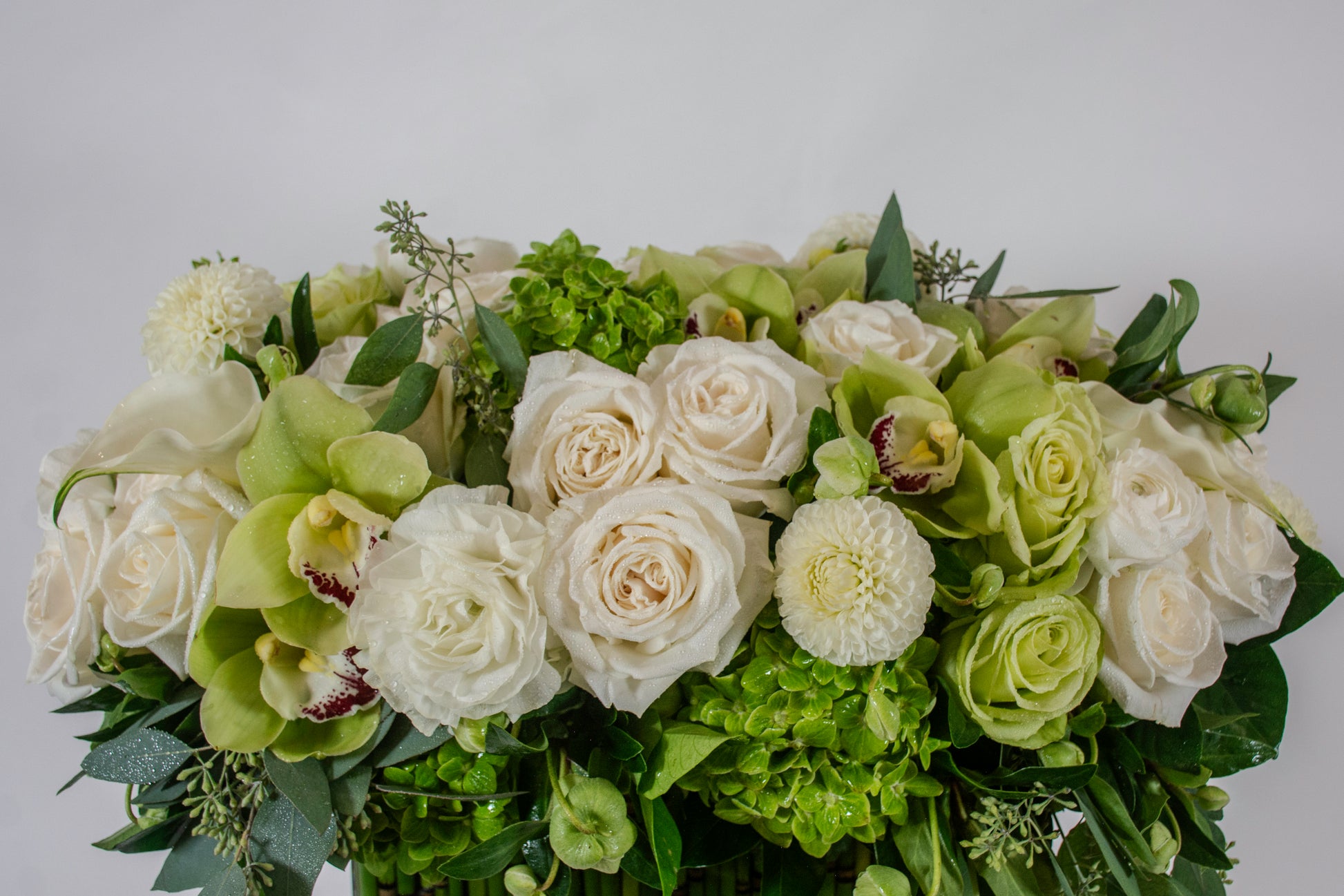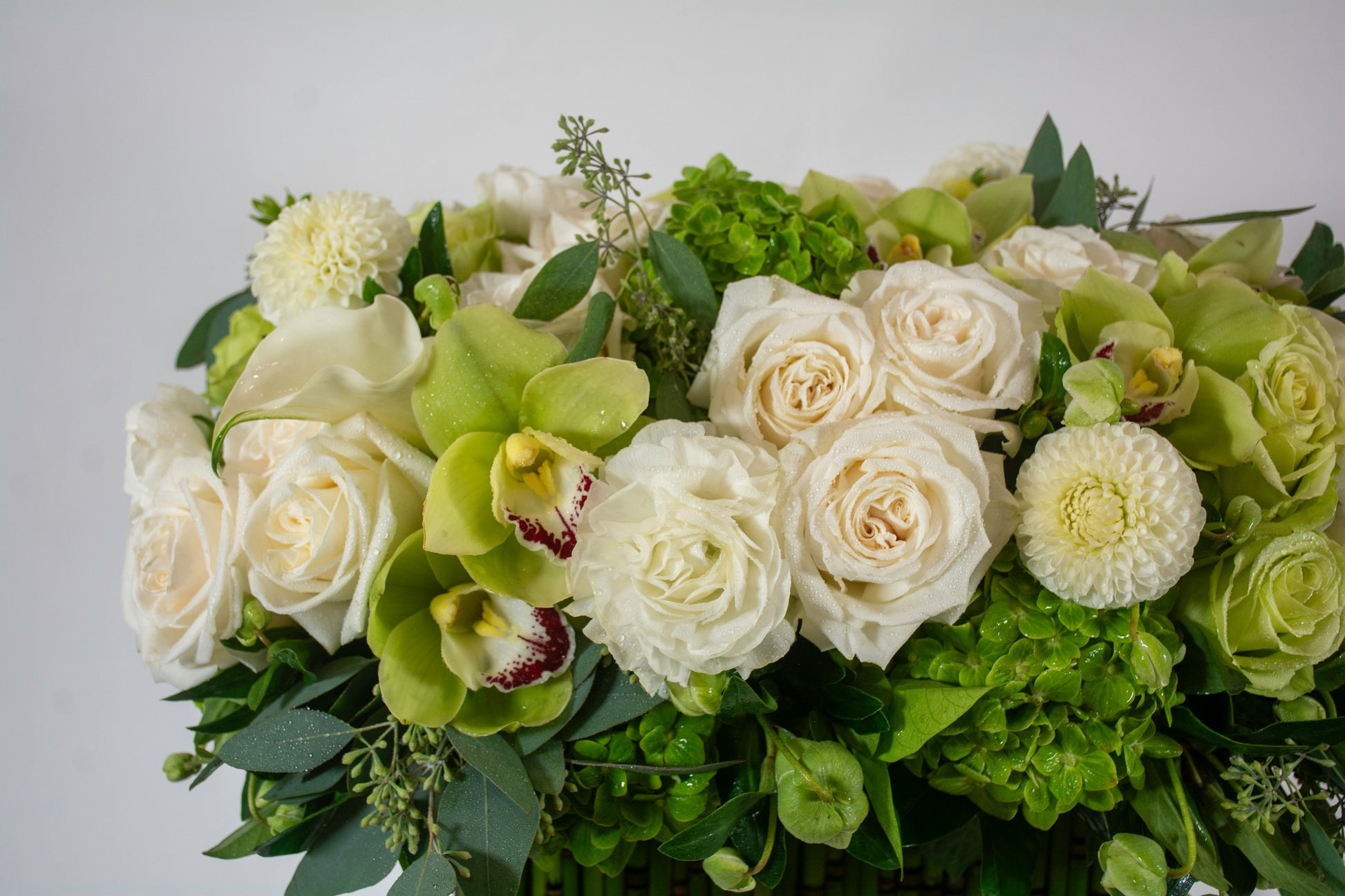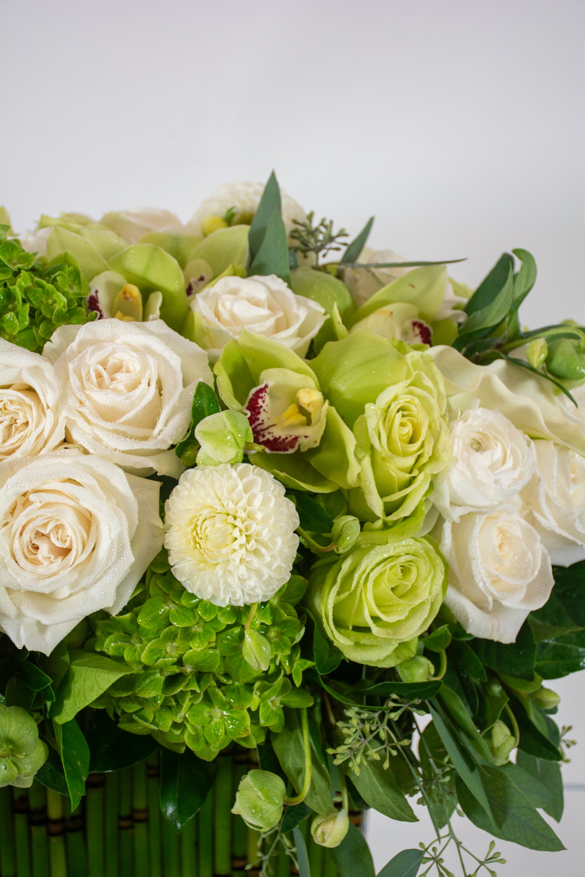 Madison Meadow captures the essence of a secret garden with creamy white Roses alongside soft Dahlias, ivory Calla Lilies, and lush green Hydrangeas. Playful pops of green Cymbidium Orchids add charm to this fresh composition.
