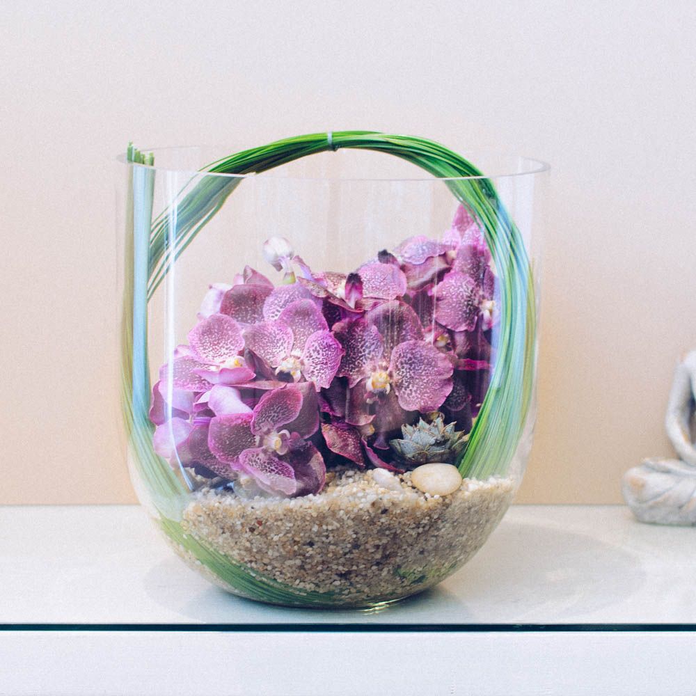 A modern take on the classic terrarium, this personal garden features magenta vanda orchids, natural river rocks, tan gravel, and miniature succulents. This unique new design rests within an 11" tall and 11" wide transparent vase.