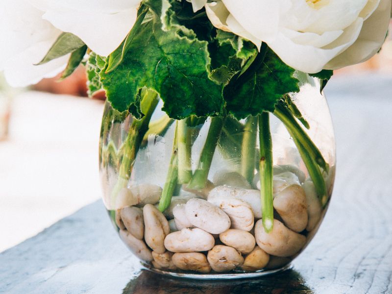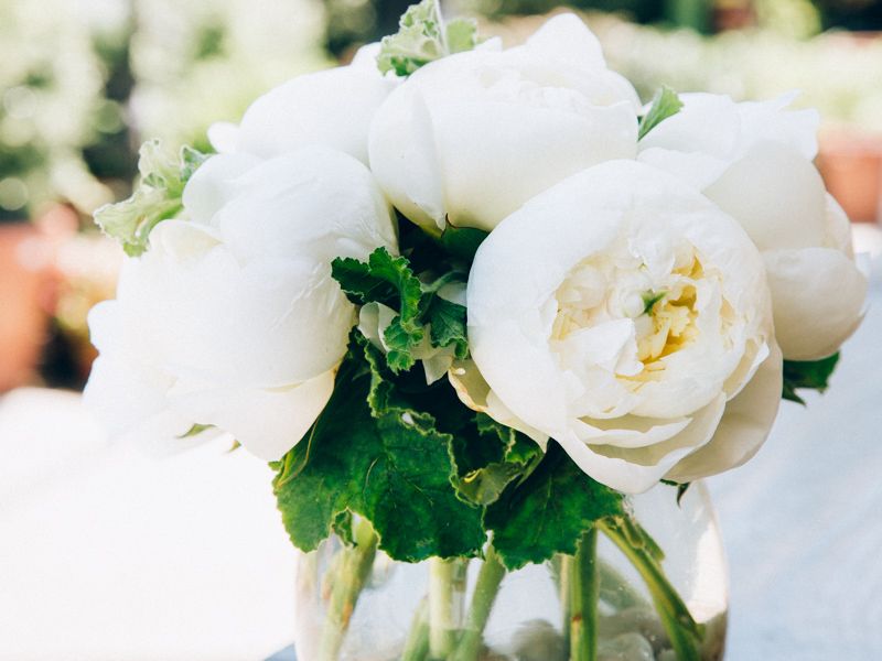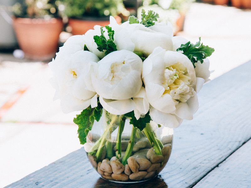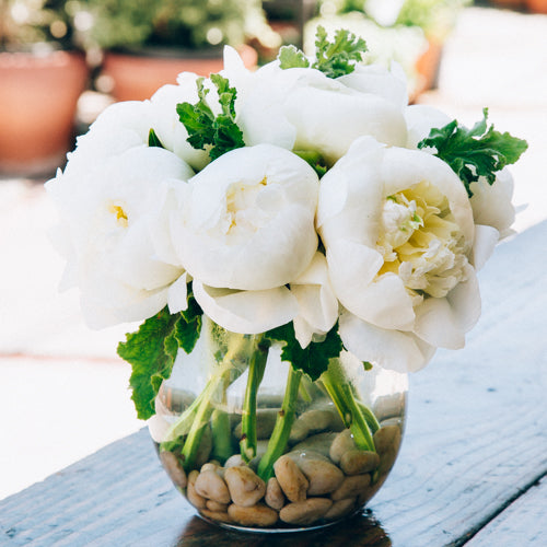 This elegant arrangement emits a glow no matter the time of day. Ivory white peonies blossom in each direction, with green foliage creating a beautiful contrast. Resting inside a 6” by 6” glass vase, cream-colored rocks rest submerged at the bottom. Overall this arrangement stands 11” tall and 11” wide.