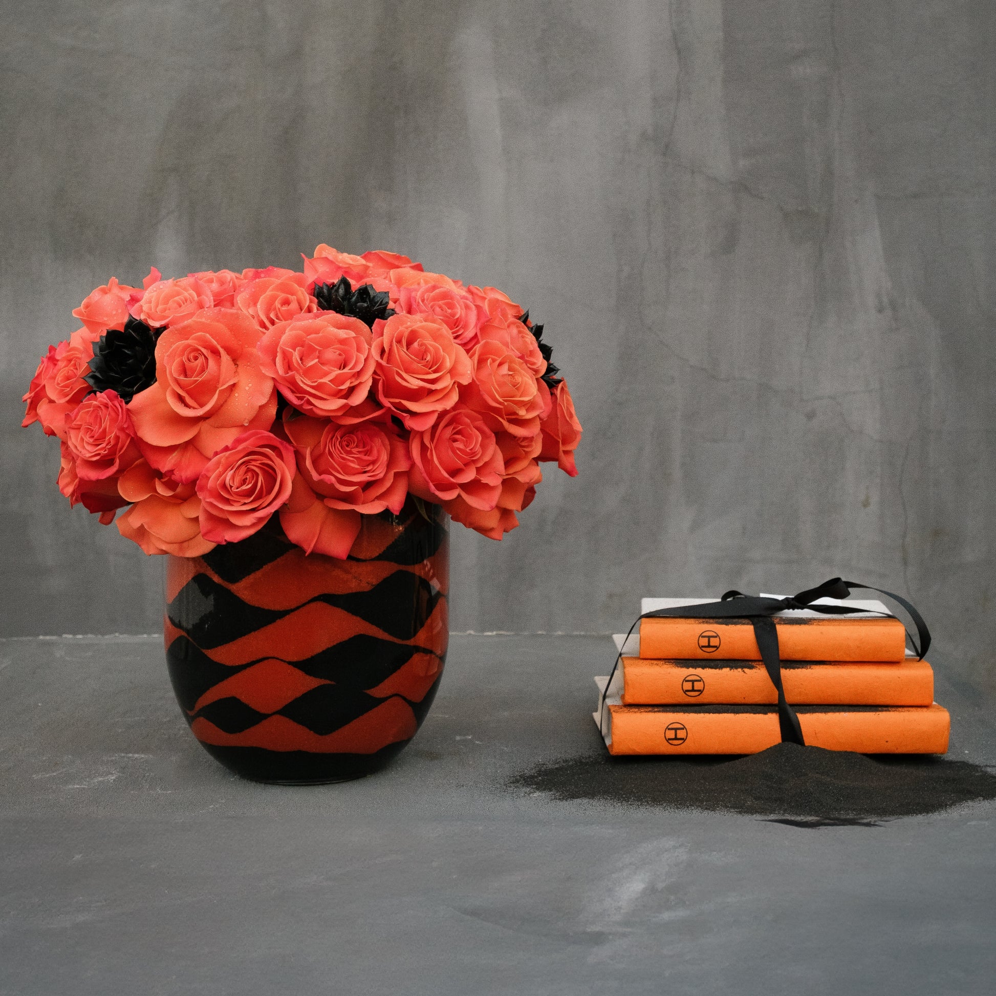Enigmatic and enchanting, Witch’s Bloom conjures the perfect balance of mystery and allure. A vivid gathering of tangerine and burnt-orange roses, and black painted succulents, creating a bold, otherworldly statement. Designed in a hand-painted harlequin-patterned vessel, this arrangement casts a spell of sophistication, ideal for Halloween soirées, moody dinner tables, or as a striking centerpiece for the season.