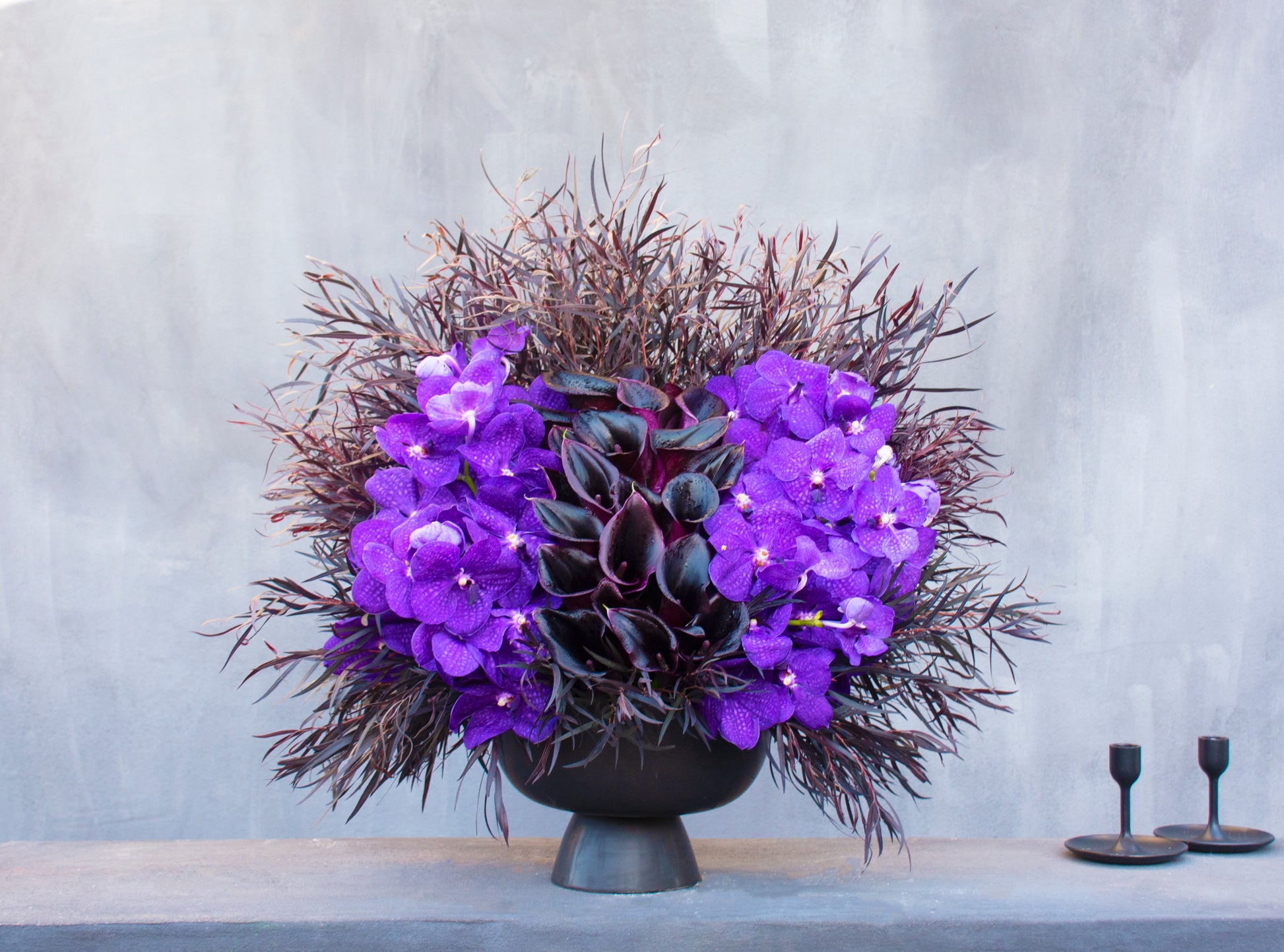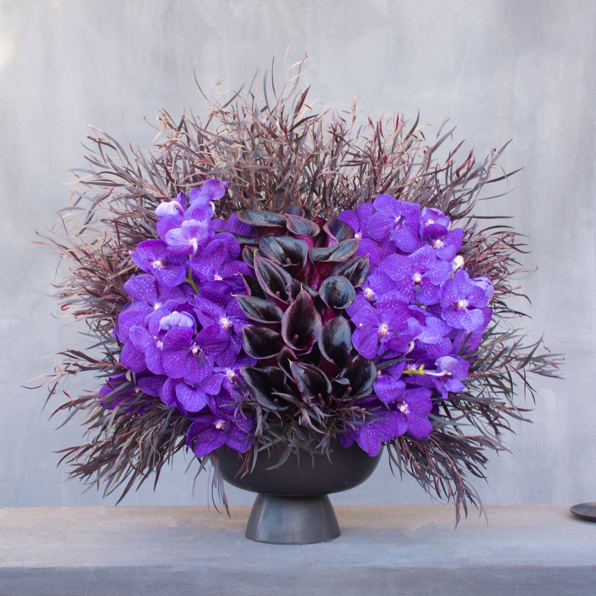A striking display of elegance and depth, Midnight Peacock commands attention with its moody, fan-like silhouette. Deep burgundy foliage sweeps upward like the regal tail of a peacock, setting the stage for a dramatic cluster of near-black calla lilies—sleek, mysterious, and full of allure. Flanking this velvety darkness, two fans of vibrant purple vanda orchids unfold in perfect symmetry, their delicate petals offering a mesmerizing contrast. Nestled in a bold black pedestal vase, this arrangement is a statement of sophistication spanning at 21 inches tall and 23 inches in width.