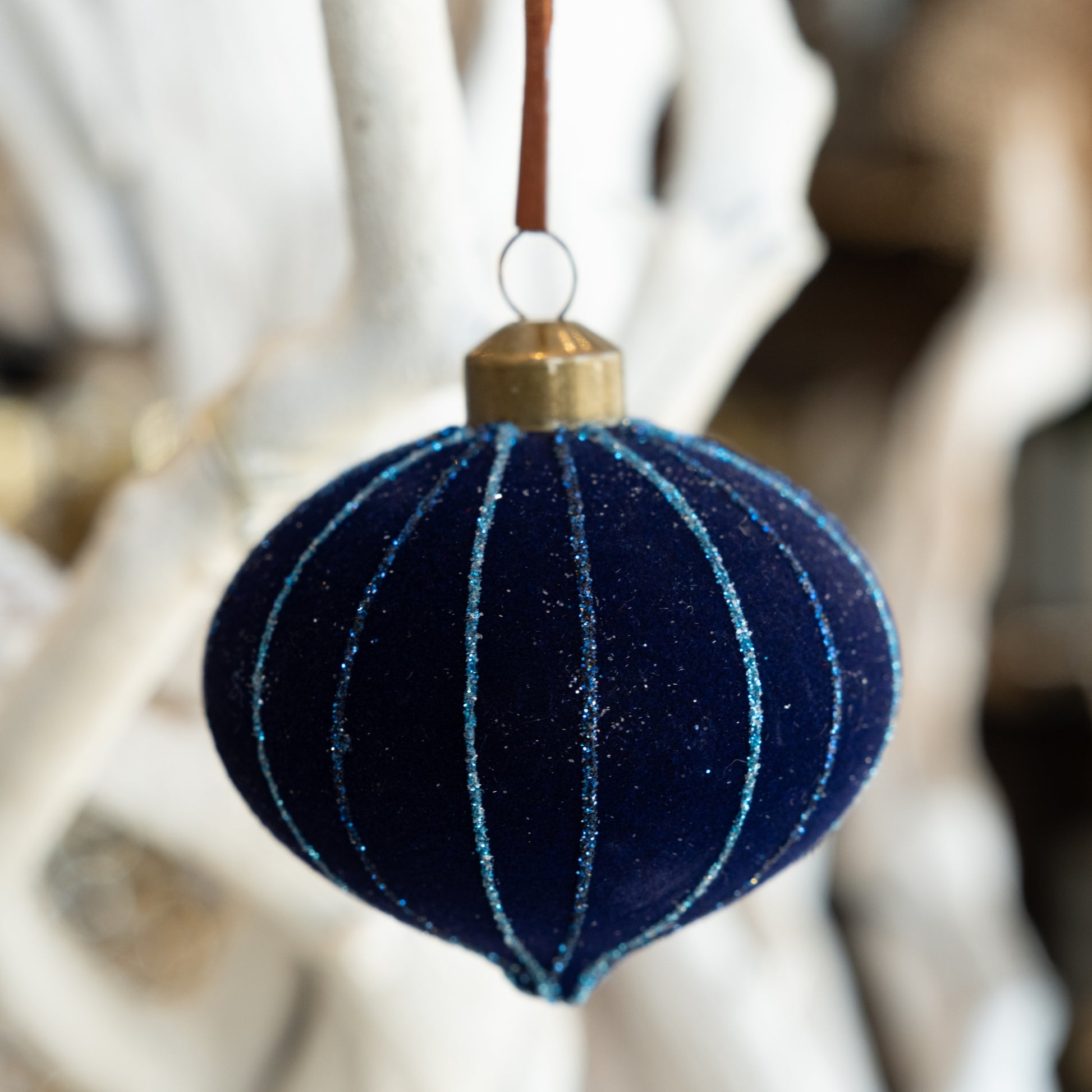 This exquisite velvet blue ornament combines tactile luxury with eye-catching sparkle. The plush velvet surface provides a sophisticated matte foundation, while a shimmering line of glitter traces elegantly across the form, creating dynamic visual interest. Perfect for curators seeking ornaments that balance understated elegance with subtle glamour, this piece adds depth and texture to holiday arrangements. The jewel-tone blue works seamlessly with both classic and contemporary styling, making it an investment-worthy addition to your collection.