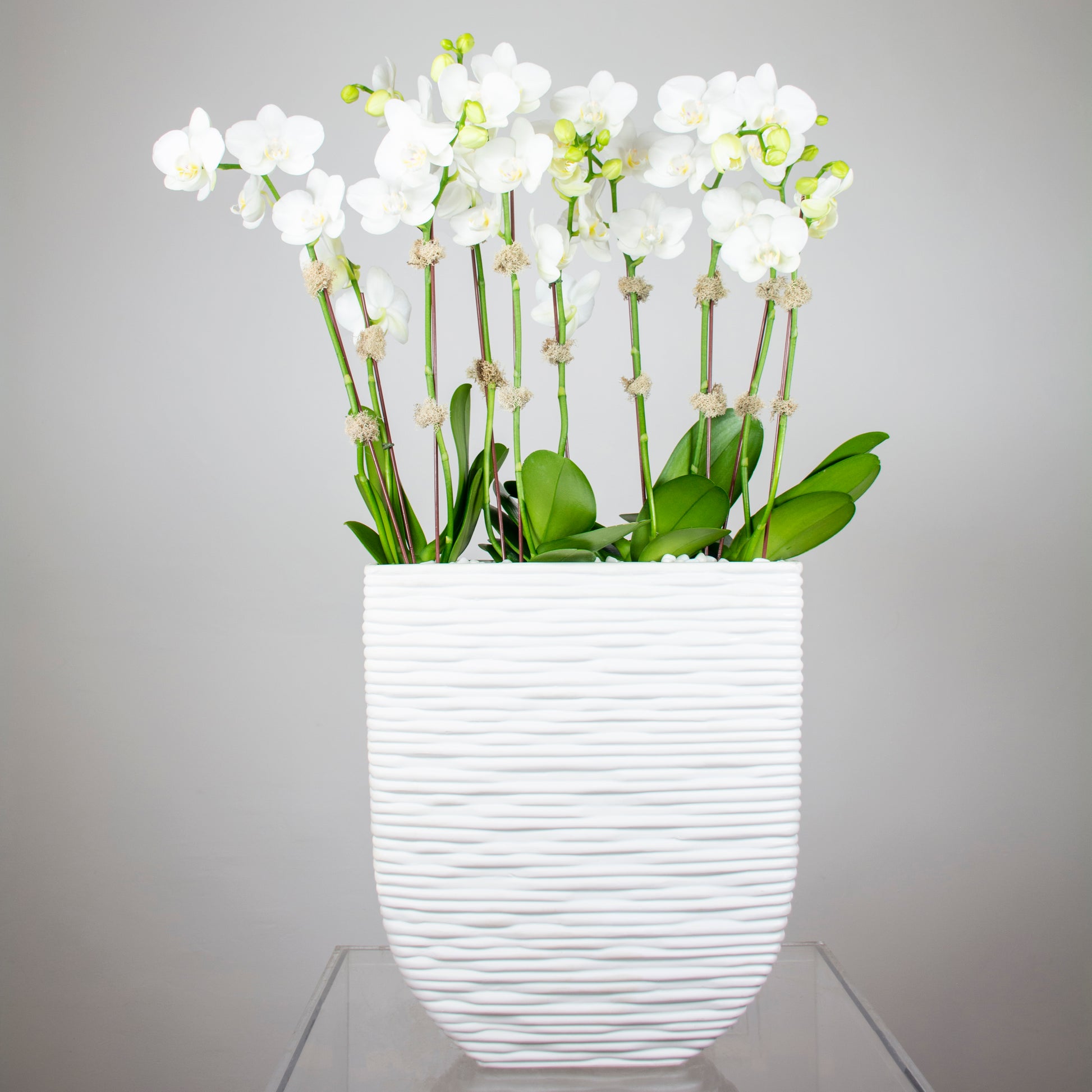 10 delightful orchid stems stand tall resting in white river rocks. This arrangement offers a modern approach to orchids, the flower that represents uplifting energy. Standing inside a 15 inch tall vase, this design will be a great addition to any home.