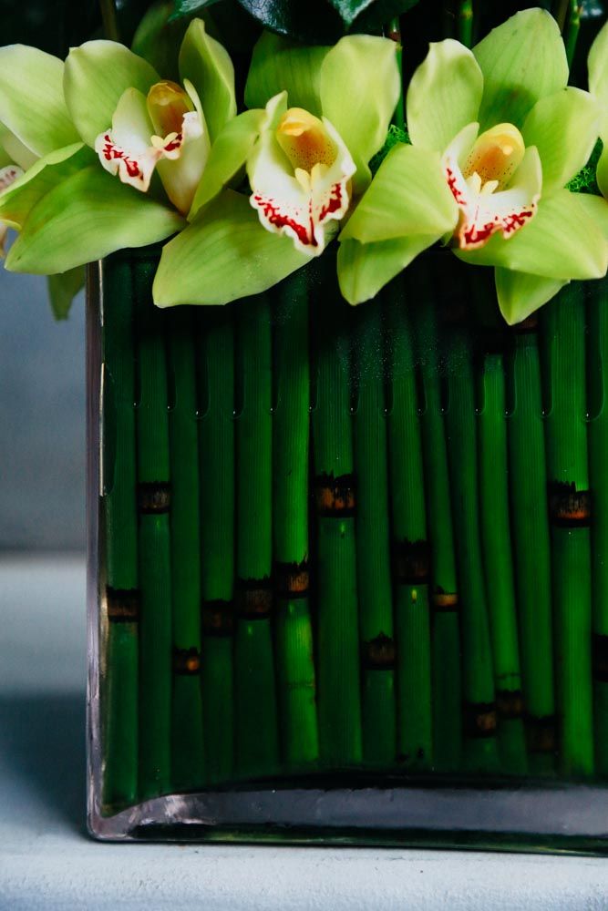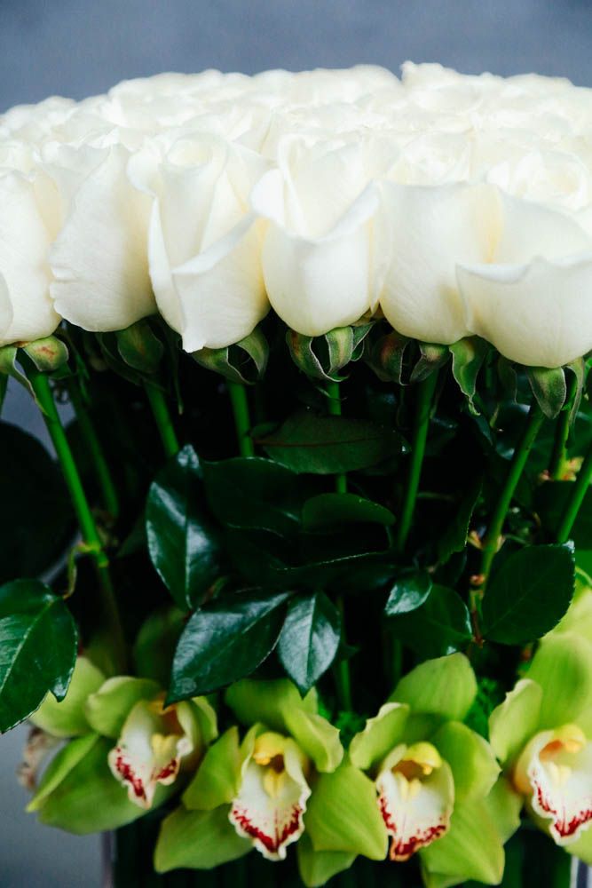 Embrace the divine glow of the white Tibet rose in this sculptural, structured floral arrangement. Up to 50 roses are gathered in a square of Horsetail lining an 8 inch square glass vase adorned by lime green Cymbidium orchid blooms. Overall, the Moon Over Kyoto stands at about 16 inches tall.