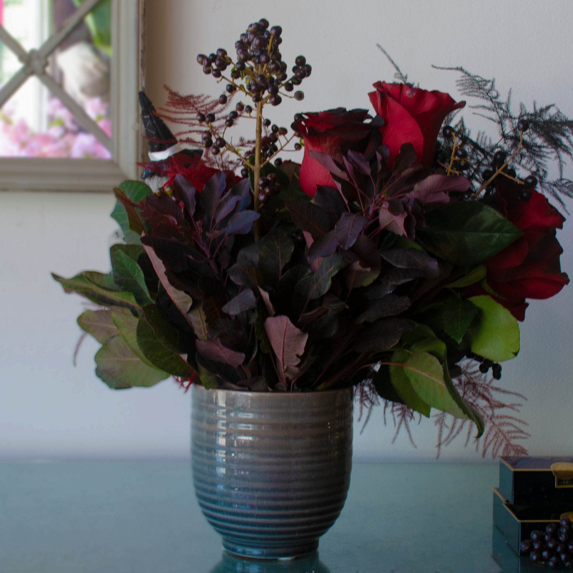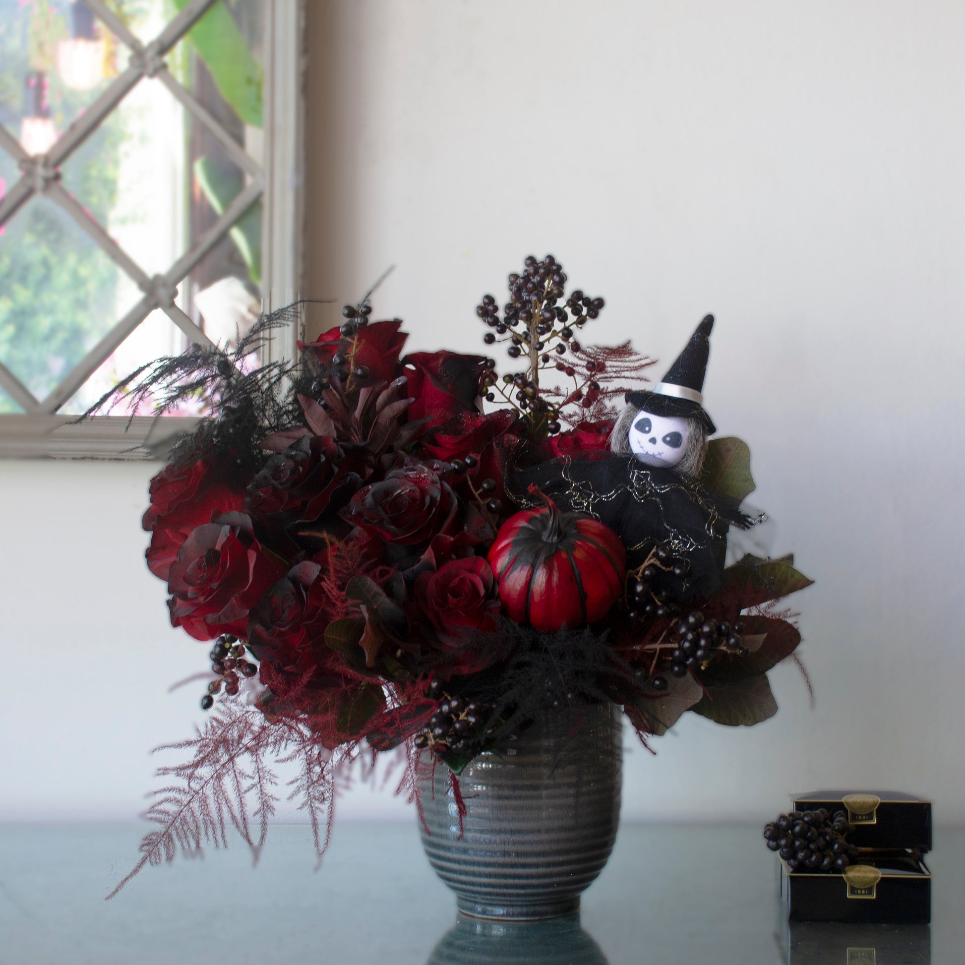 Capture the essence of autumn’s allure with our Mystic Harvest arrangement. Set in a stunning grey ceramic vase, this 14 inch tall, 14-inch wide masterpiece features unique red Explorer Roses with dramatic black-edged petals, exuding mystery and elegance. Accented with rich black Plumosa Fern, black berries, and a mix of seasonal Fall foliage, it’s the perfect blend of dark romance and spooky sophistication. A mini red pumpkin and a whimsical witch ornament add a playful nod to Halloween, completing this captivating centerpiece for your seasonal celebrations. Embrace the magic of Fall with this spellbinding display!