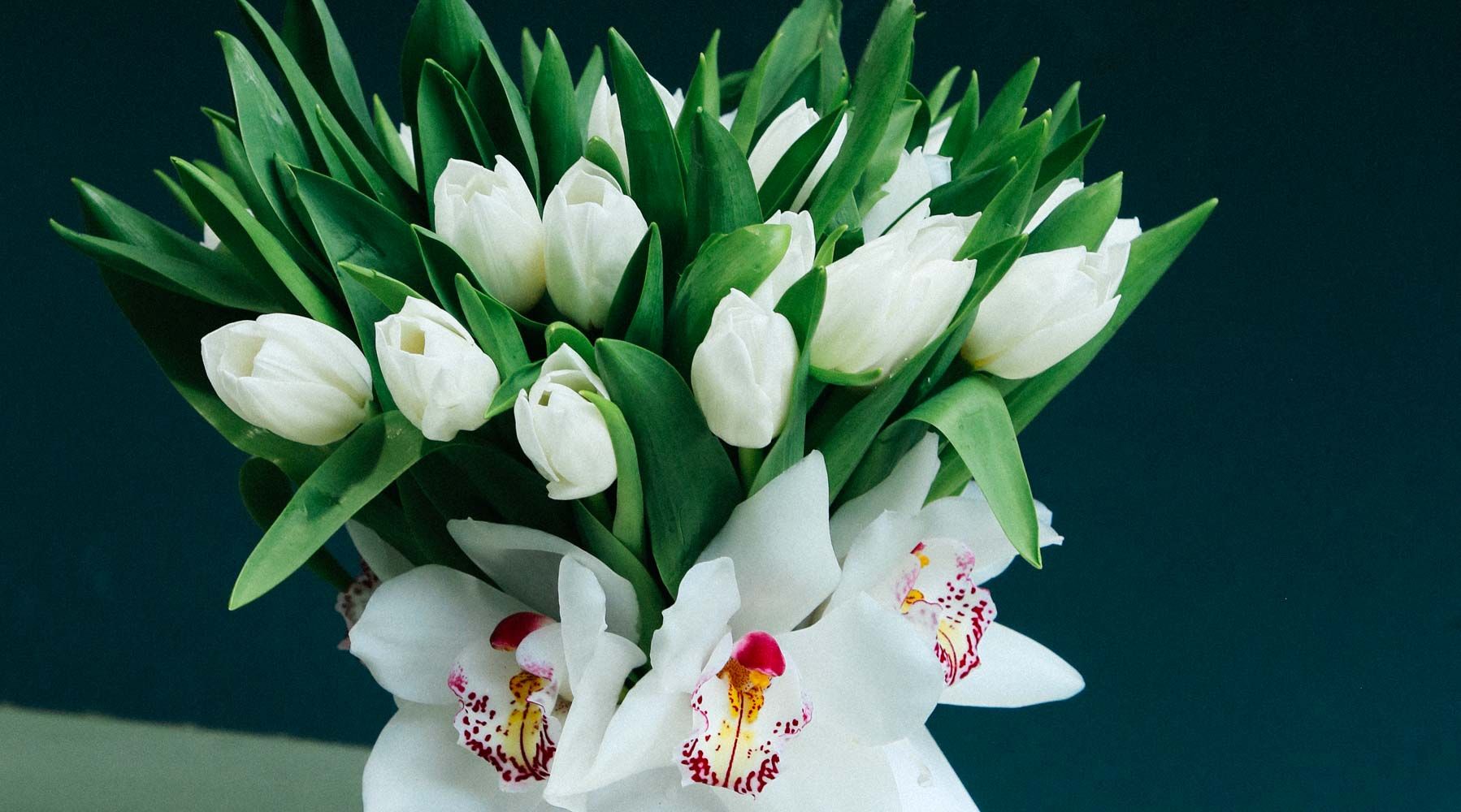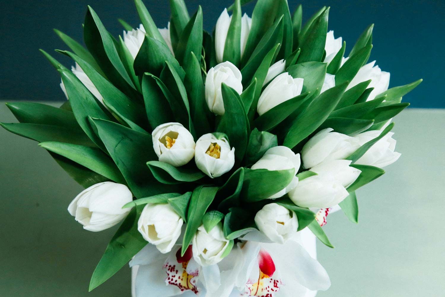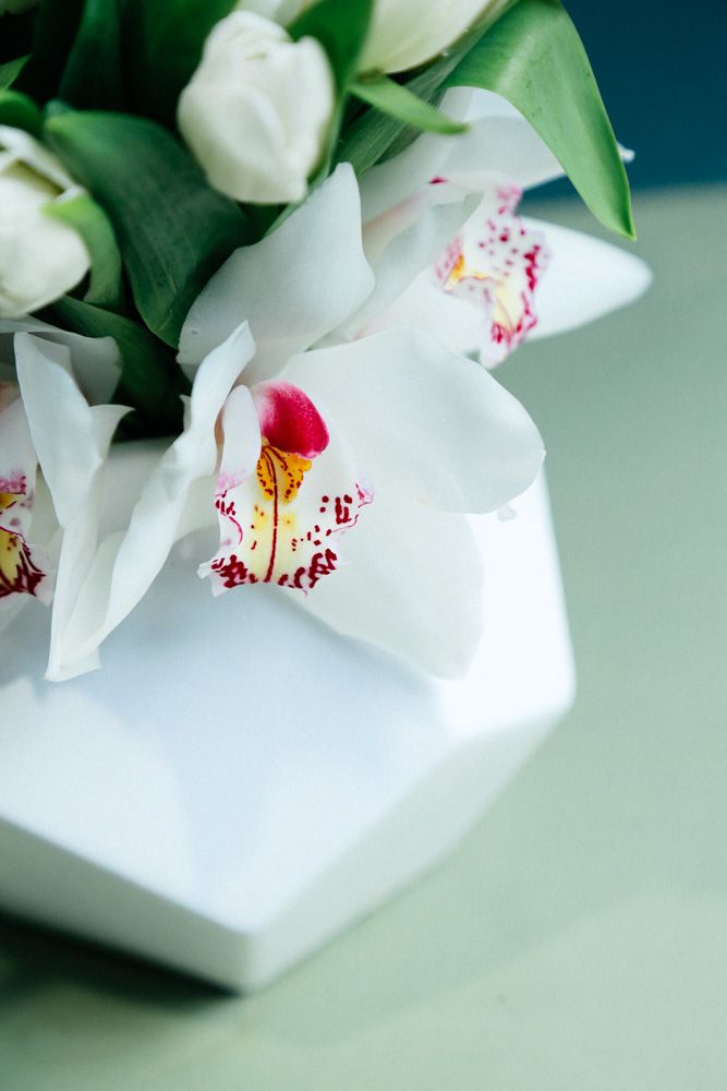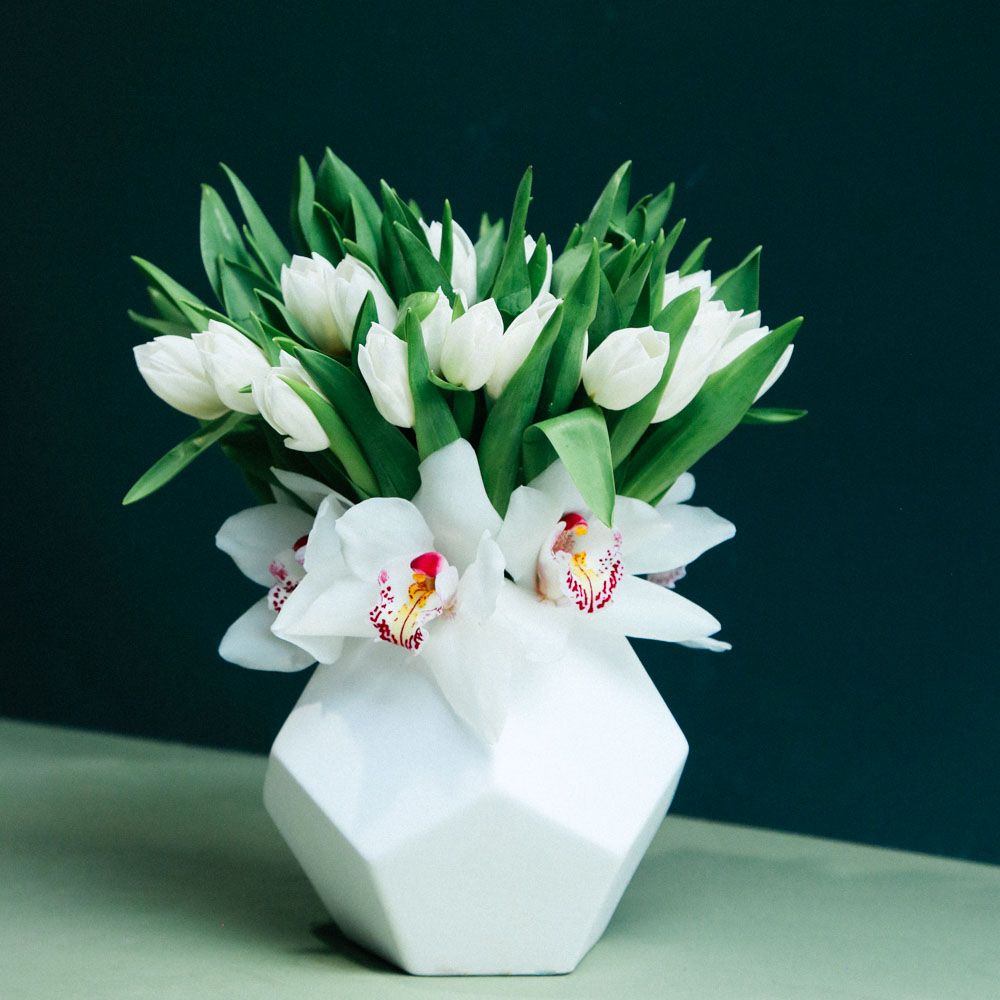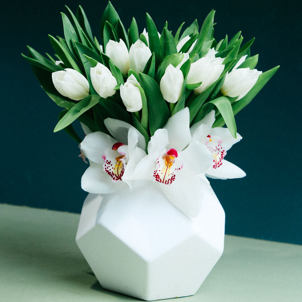 Modern Beauty and creative design can both be seen in this stunning floral arrangement. Up to 30 pure white tulips are gathered together and bordered by lush opal white phalaenopsis orchids. Resting inside a 6” hexagonal ceramic white pot, overall this arrangement stands about 14” tall.