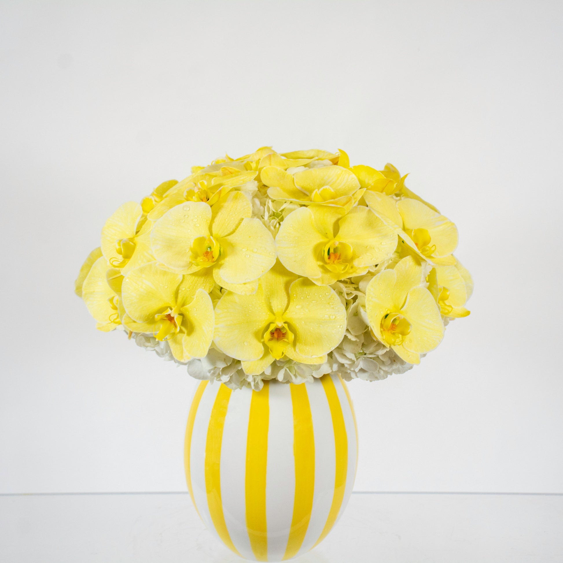 Sunny Orchids is a classic all-yellow Phalaenopsis orchid arrangement nestled in a cheerful yellow and white striped vase, beautifully crowned with billowing clusters of pristine white hydrangeas.