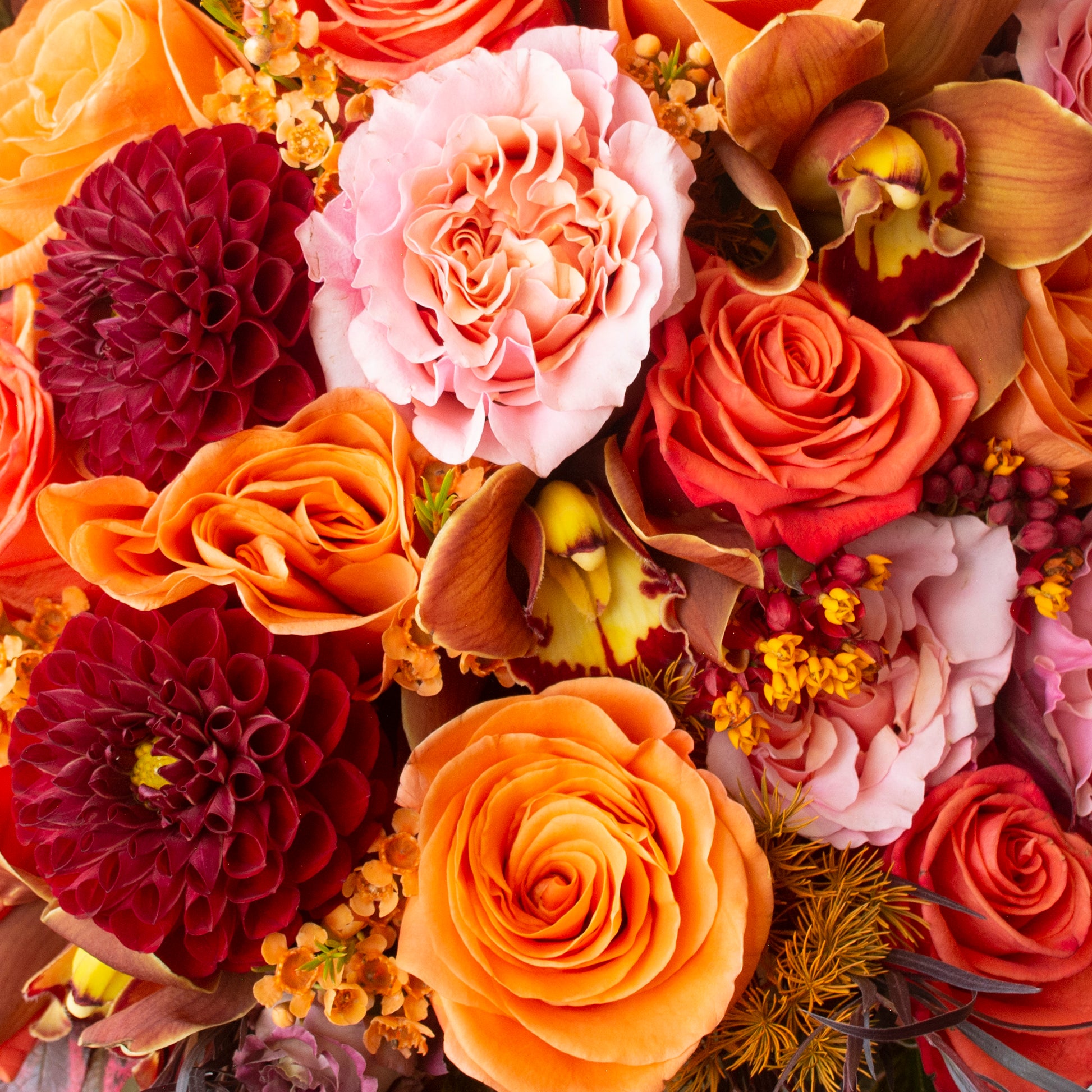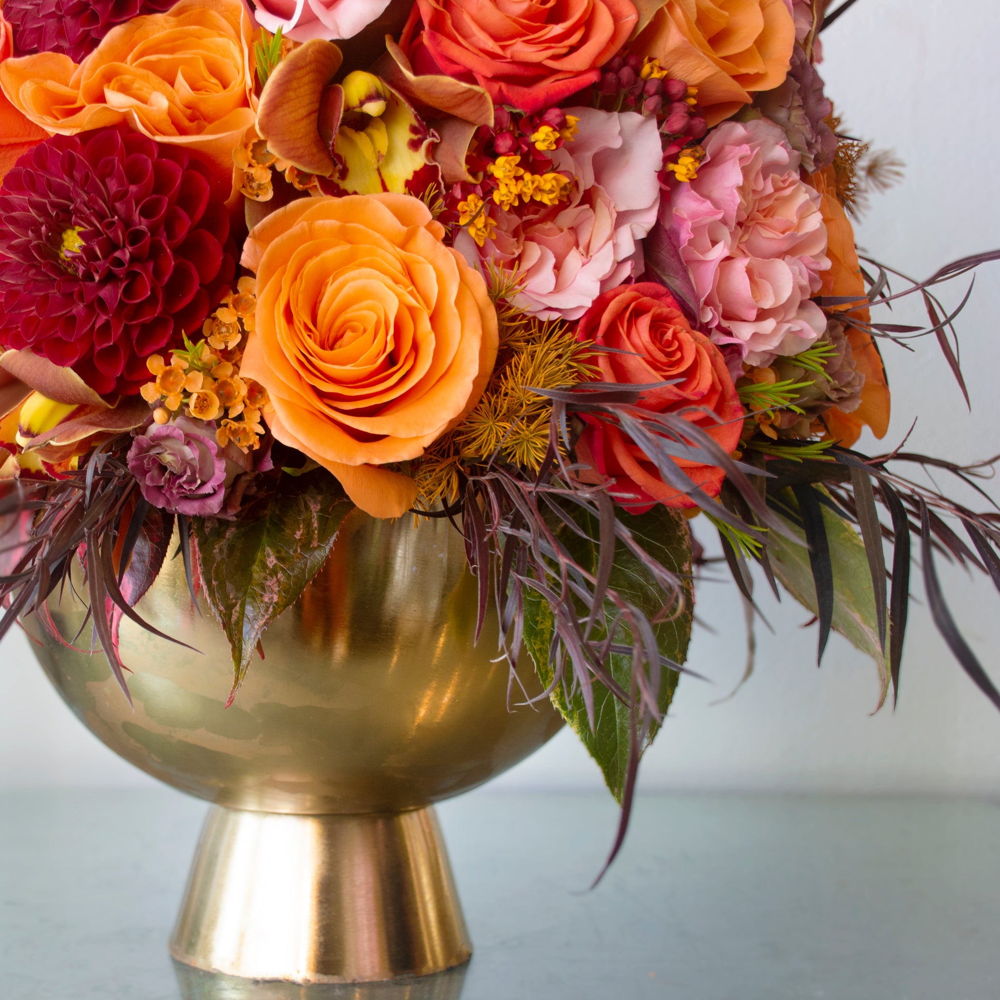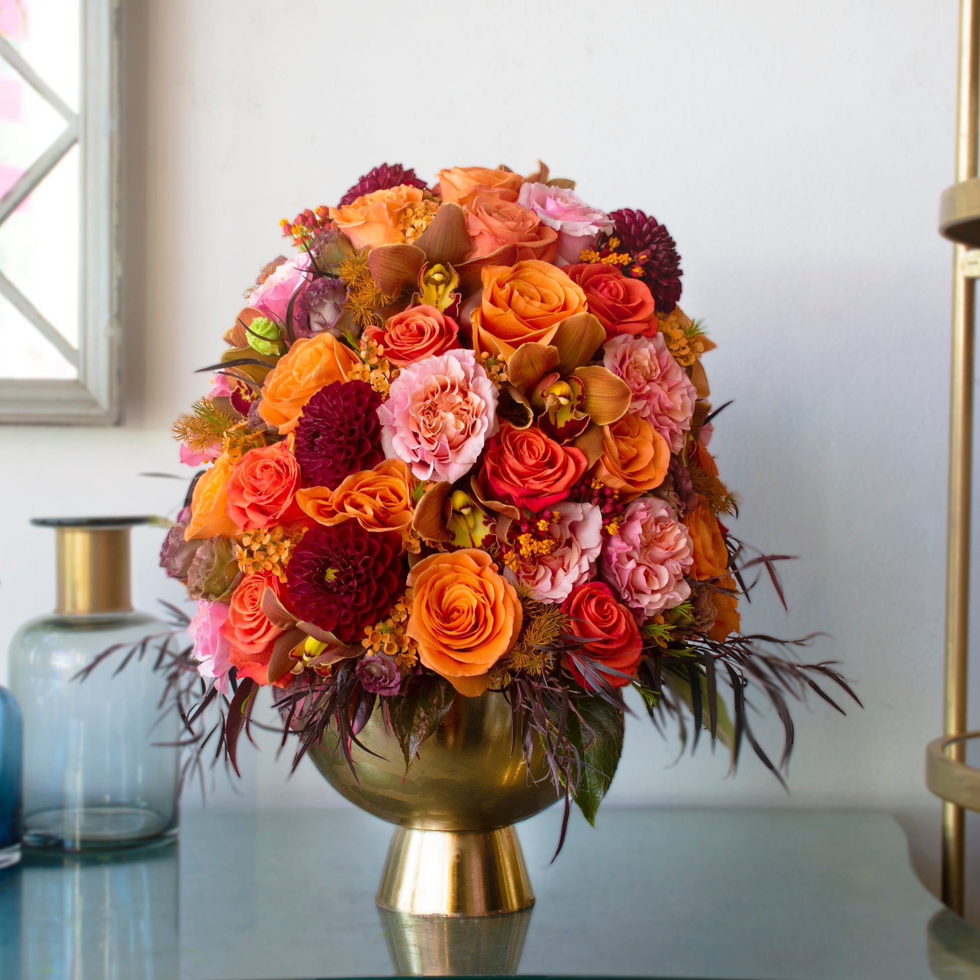 This regal blend of rich Autumn tones evokes the warmth and beauty of the season. A whimsical egg shape set atop a luxurious gold pedestal vase, the Amber arrangement features vibrant orange Roses, fiery Pink Floyd roses, and soft pink Garden Roses. Contrasting burgundy Dahlias add depth, while deep orange Cymbidium orchids and delicate Wax Flowers add a touch of amber. Finished with seasonal Fall foliage, this 16-inch tall and 13-inch wide masterpiece is the perfect piece of Autumn décor.