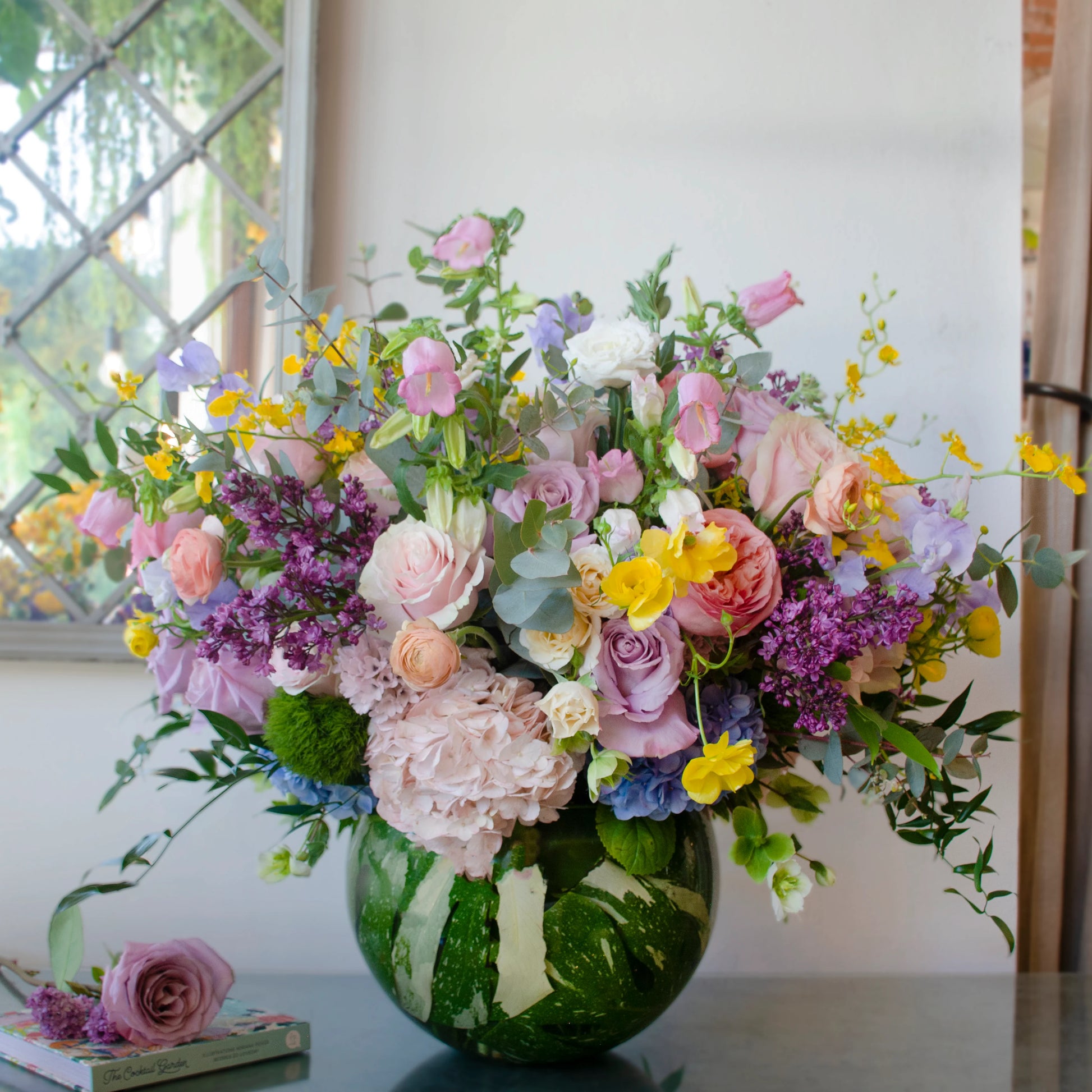 Welcome to the enchanting world of "Paradise Jungle" – a breathtaking pastel masterpiece that orchestrates a symphony of floral delights. Nestled within a fishbowl vase, adorned with variegated Monstera leaves for a touch of untamed beauty, this arrangement is a true spectacle. At its core, soft hues of hydrangea form a serene foundation, complemented by a medley of lavender roses, delicate pink expression cream garden roses, lively lilac, peach-toned ranunculus, velvety sweet peas, scabiosa, vibrant yellow butterfly ranunculus, and whimsical oncidium orchids, all dancing together in harmony. The addition of campanula lends a playful charm, while winter rose, eucalyptus leaves, and green dianthus provide the perfect finishing touches. Standing proudly at 20 inches tall and spanning 25 inches in width, "Paradise Jungle" is a true oasis of beauty and grace.