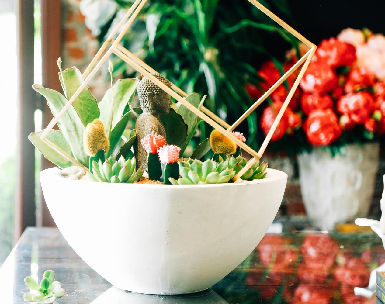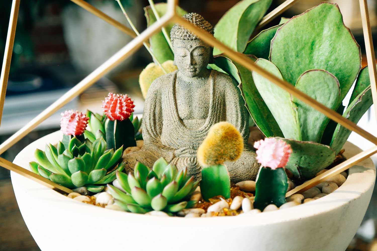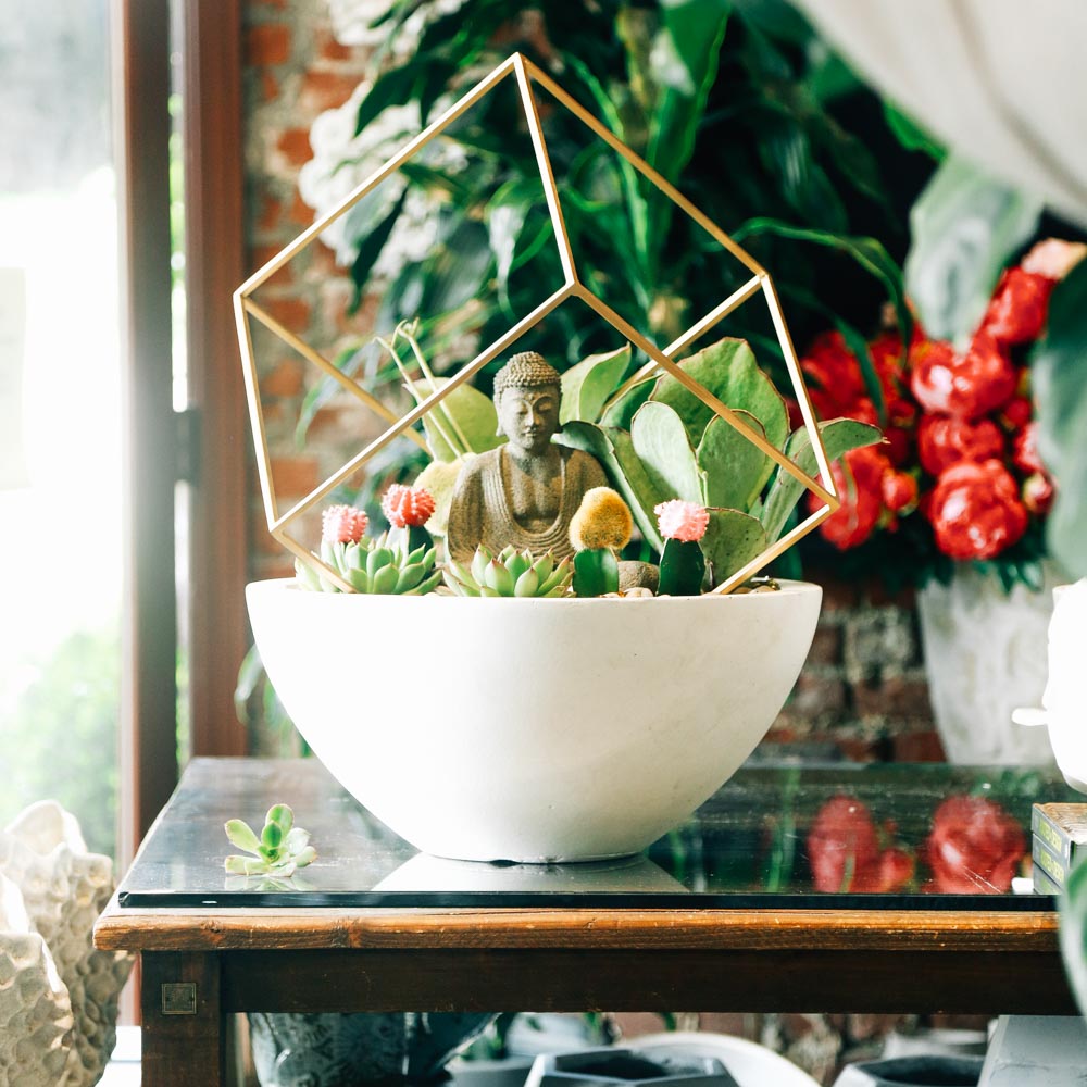 Take in the relaxation and beauty of the desert with this beautiful arrangement. Colorful cactus plants are placed throughout, some in varying colors of pink and yellow, with succulent blooms placed before the Buddha statue. Resting inside of a pristine 8.5" by 18" white resin bowl, this arrangement stands at approximately 24" tall overall.