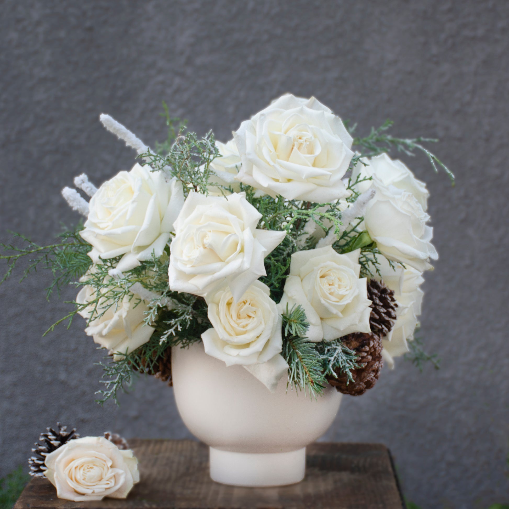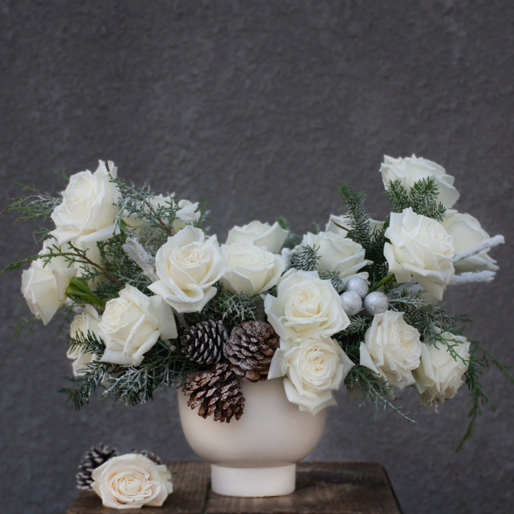 Elevate your holiday decor with a stunning white ceramic pedestal bowl showcasing winter pines, snow-kissed white roses, and rustic pine cones for a cozy, seasonal charm. Accented with silver ornaments for a shimmering touch, this elegant floral arrangement features snow-dusted branches for a festive finish. Measuring 14 inches tall and 21 inches wide, it's the perfect centerpiece for any holiday celebration.