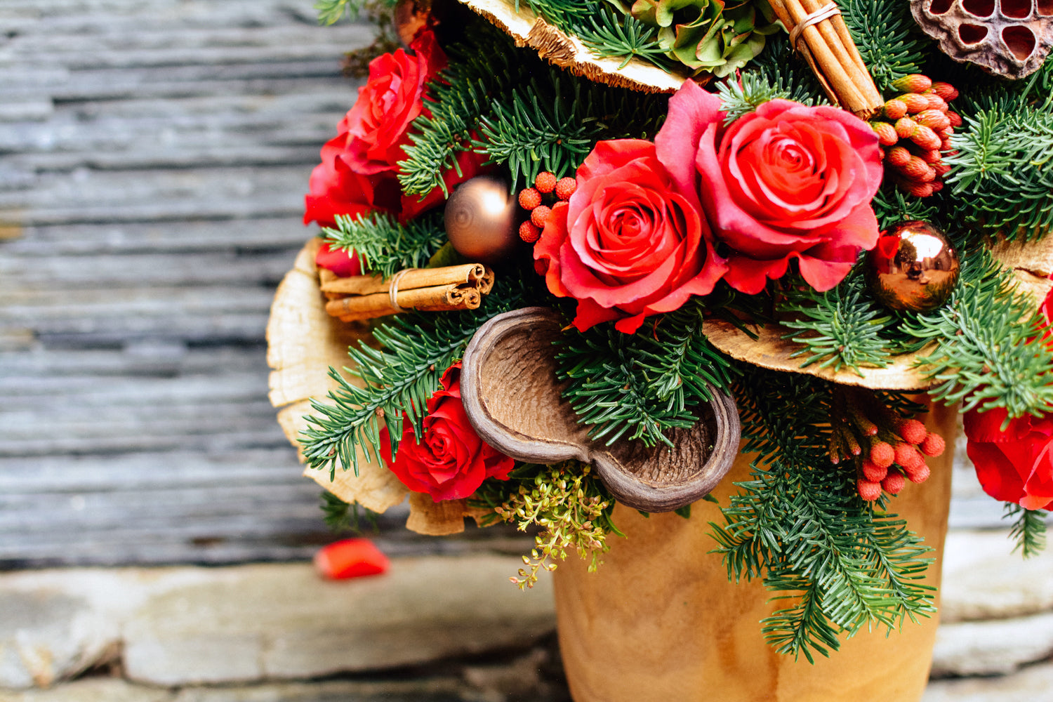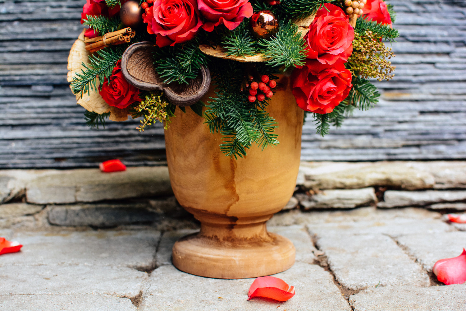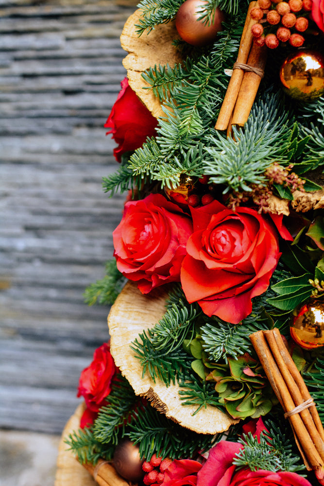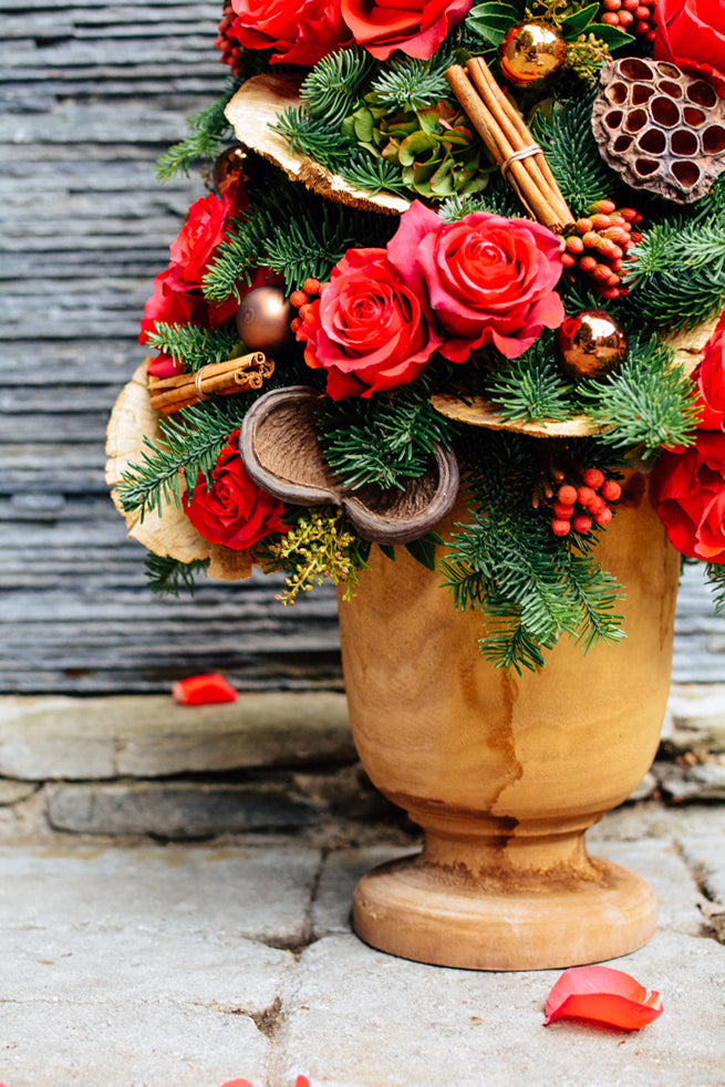 This miniature topiary tree is made of cinnamon spice and everything nice. Fresh red roses, bundles of dried cinnamon sticks, a medley of luxe holiday ornaments, clouds of green hydrangea, and other dried accents are placed throughout the fragrant pine branches. Resting atop a 12” tall natural pot, this arrangement stands at approximately 36” tall overall.