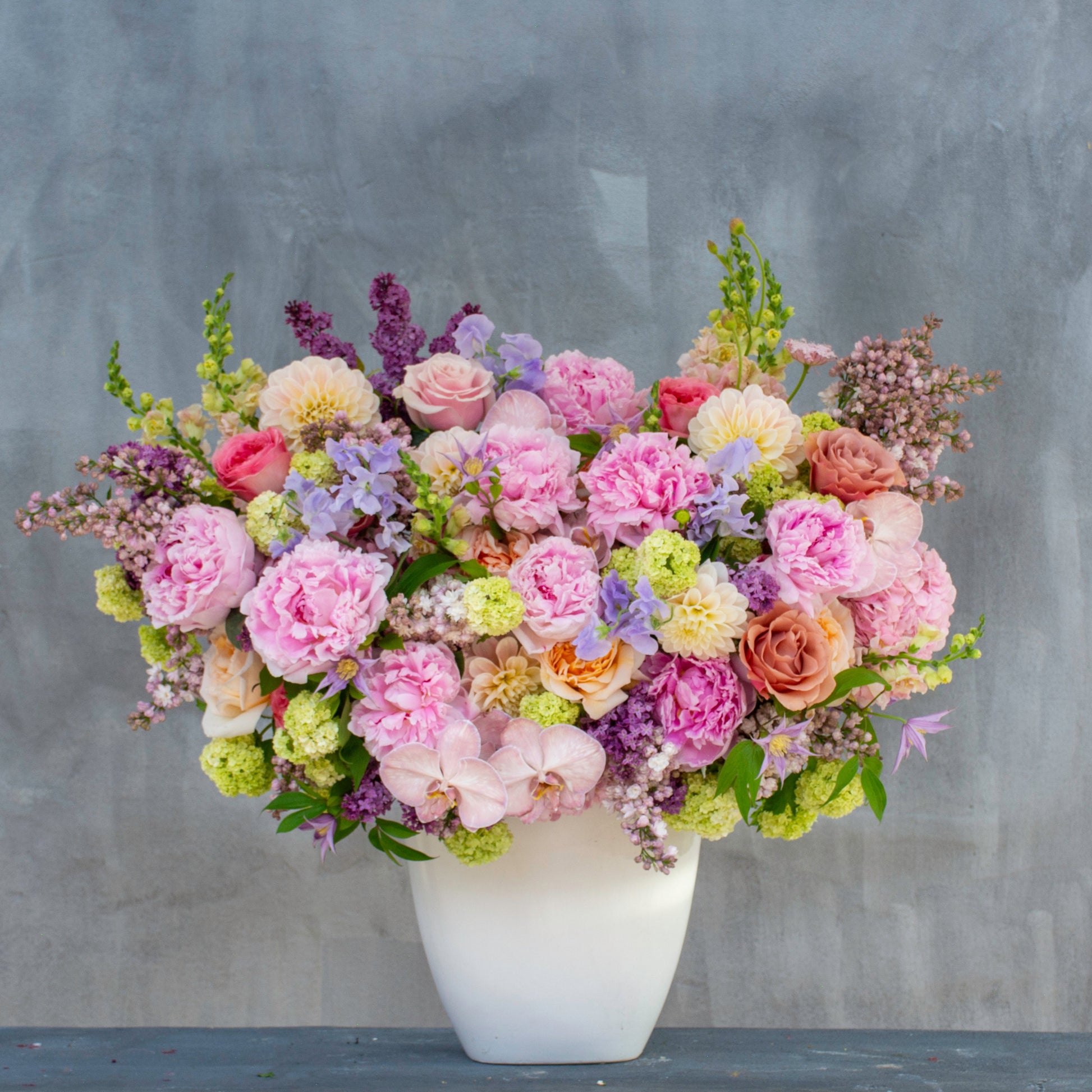 The sweetest shades and hues of Spring come together in our breathtaking and grand arrangement, Petal Crescendo, made up of blushing Chocolate Orchids, sprigs of light pink and purple Lilac, pops of Phlox and vibrant Viburnum, Quicksand and pink Roses, lavender Sweet Peas, and a touch of Clematis and Dahlias accenting the overall design. The grandeur of this design is not for the faint of heart as it stands at approximately 25 inches tall and 20 inches wide.
