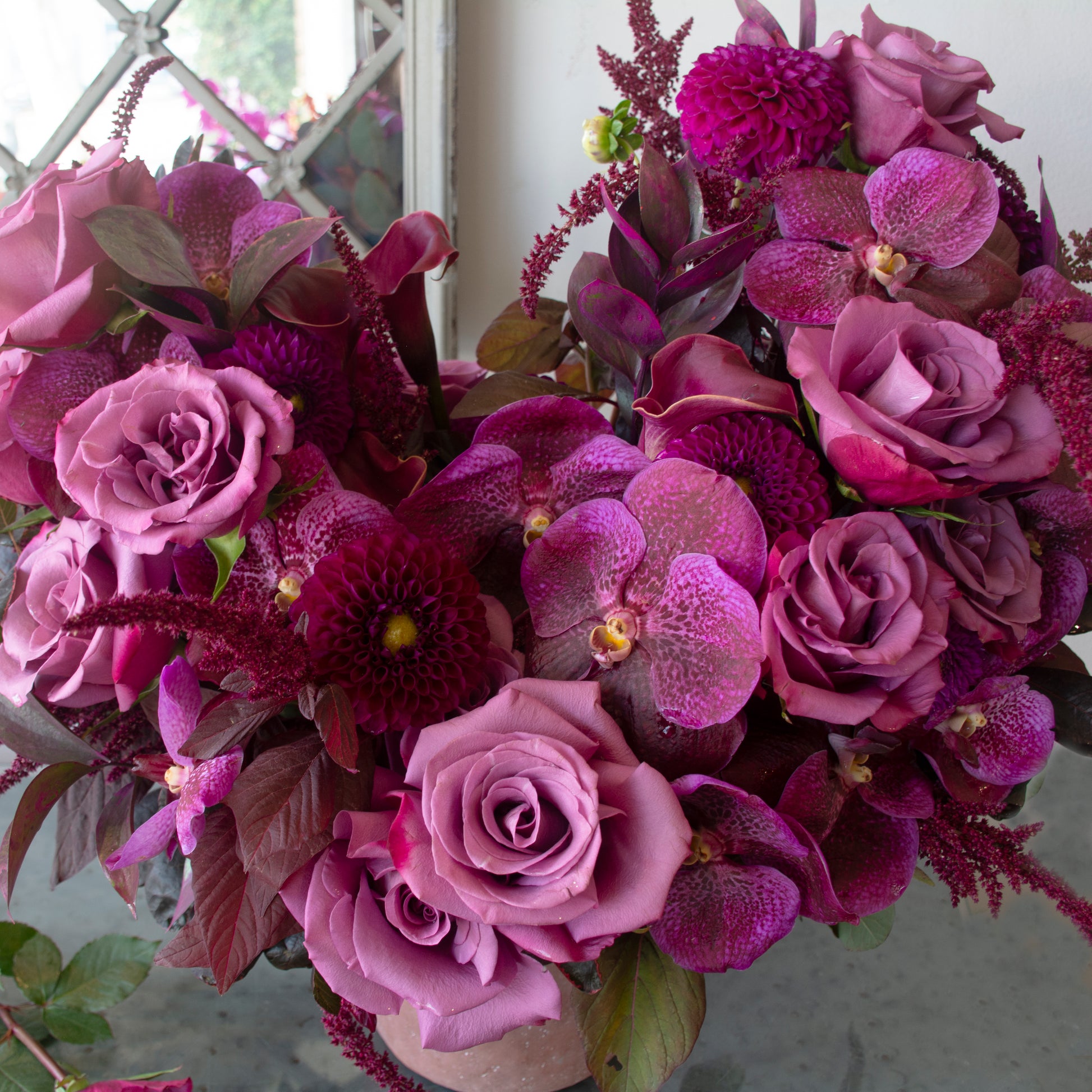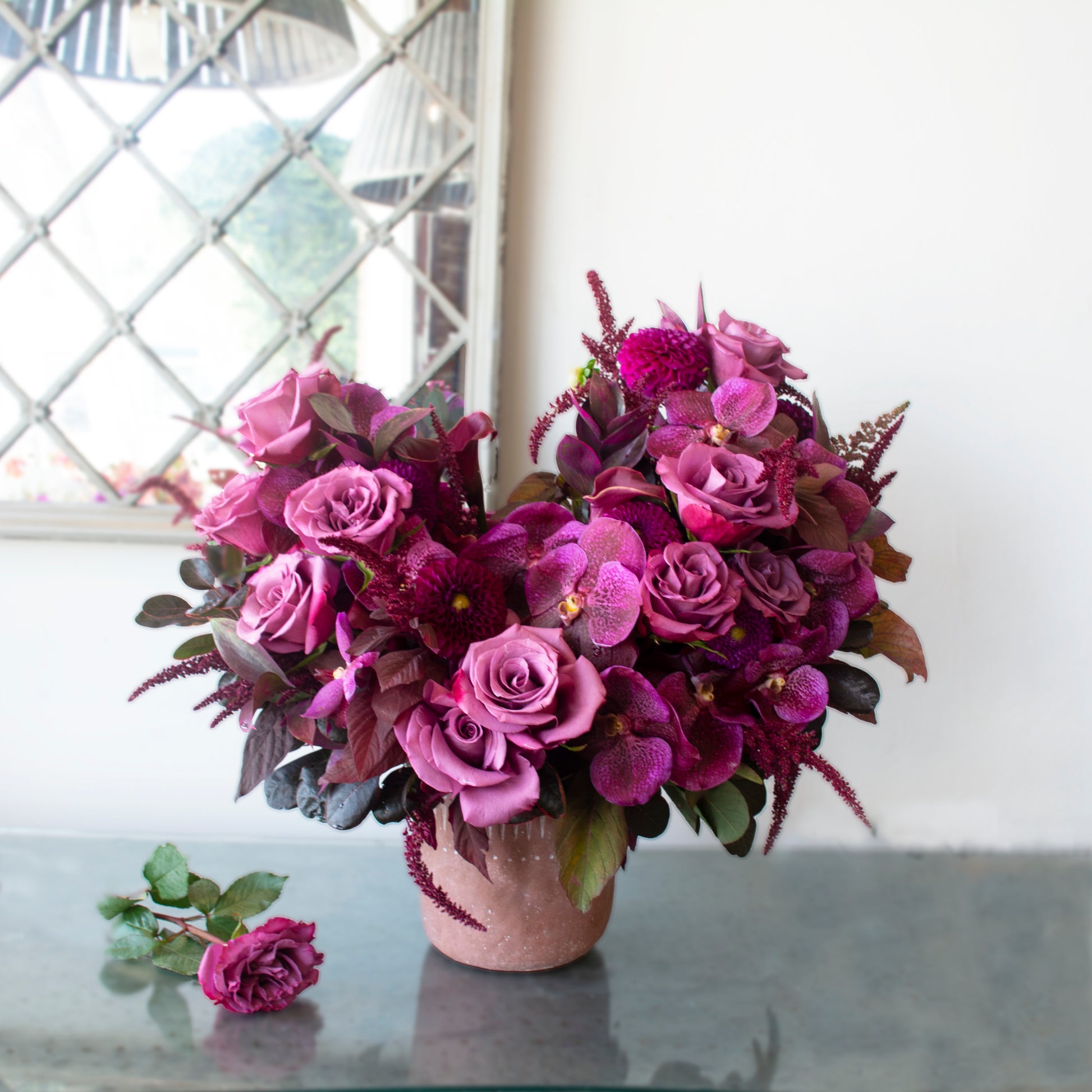 Purple Haze is an eye catching arrangement invoking feelings of eternal love, appreciation and admiration! Artfully arranged with hot pink Dahlias, Roses and Calla Lilies, surrounded by Vanda Orchids, Red Amaranthus flowers and brown leaves. Purple Haze is 18 inches tall by 19 inches wide