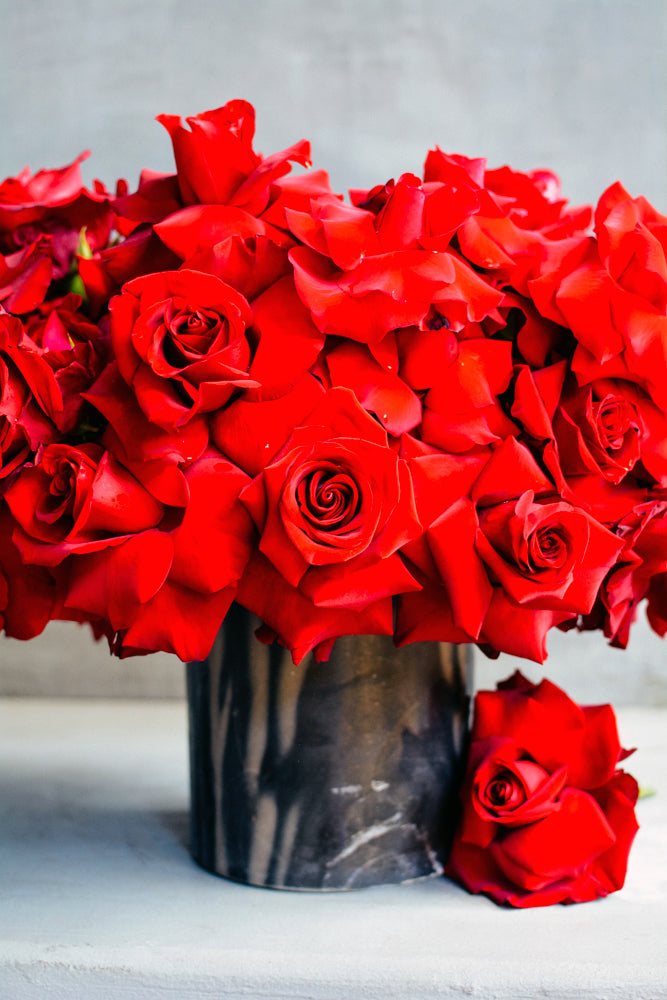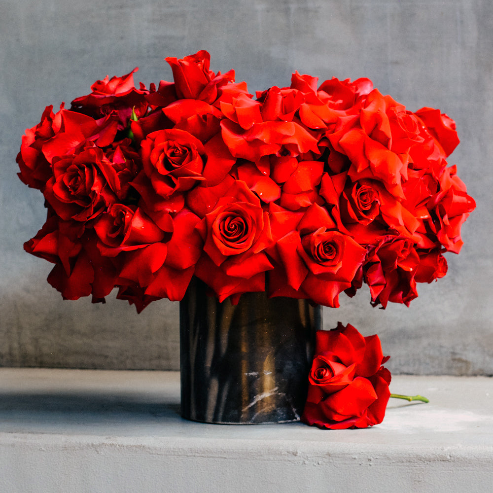 The "Queen of Hearts" features up to 50 stems of perfectly ruffled and reflexed red roses. These breathtaking blooms form a delicate in-and-out asymmetrical cloud, floating high atop a 7" x 7" black marble vase.