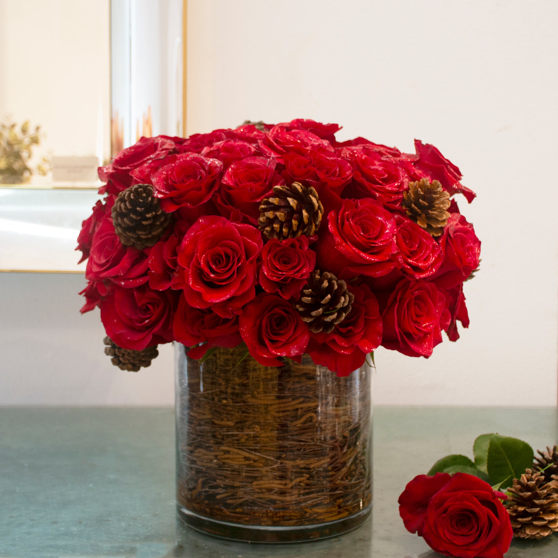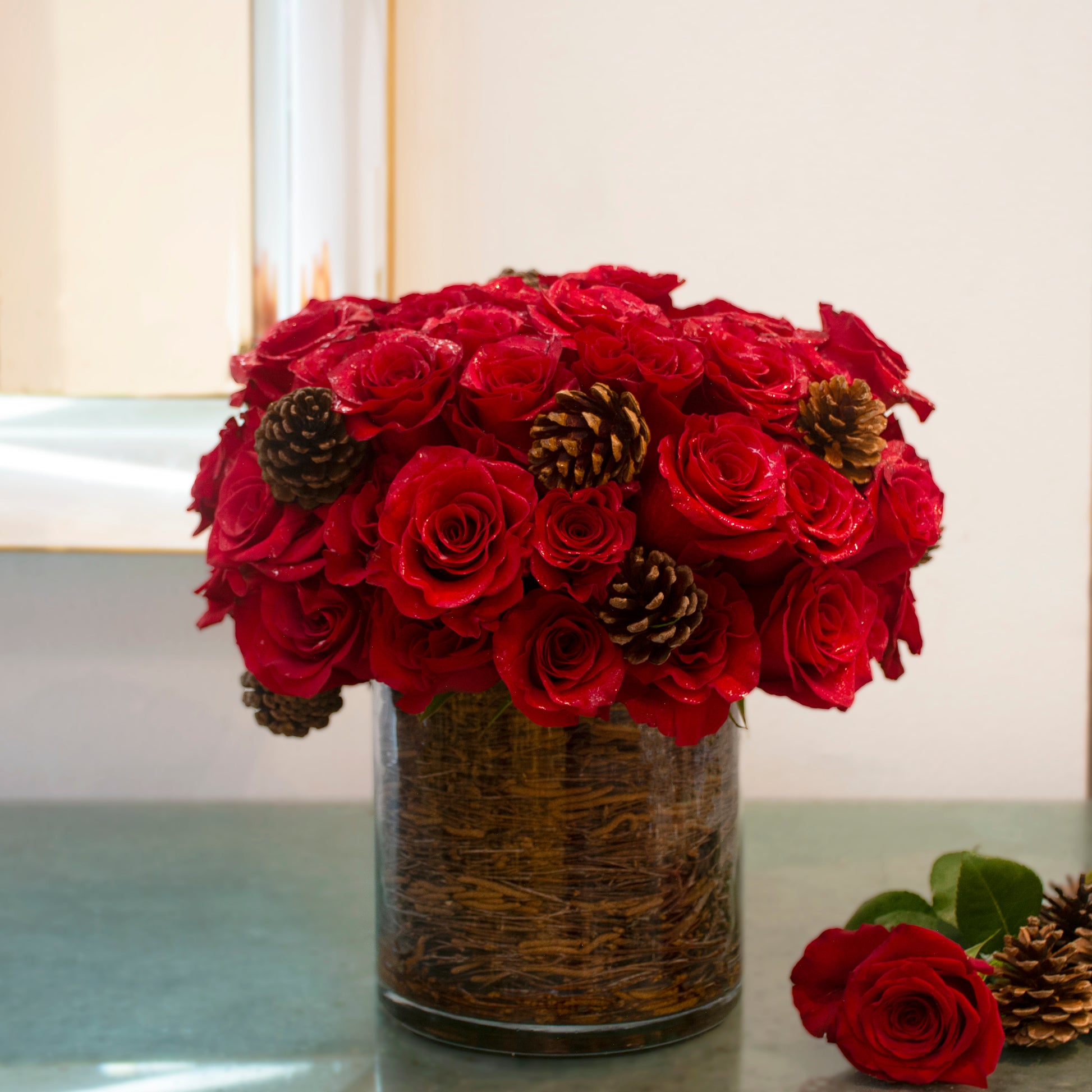 An enchanting holiday statement, Queen Victoria showcases the timeless beauty of fifty velvety red roses arranged in an artful pave style. Nestled within, delicate pinecones evoke a festive warmth, while Victoria branches lining the sleek glass cylinder vase add a modern yet organic touch. Standing 14 inches tall and spreading 16 inches wide, this arrangement is the perfect centerpiece to celebrate the season with sophistication and charm.