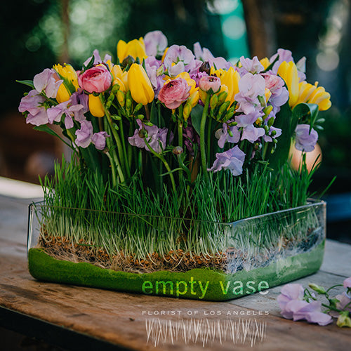 This sunny arrangement captures the vibrance of spring with it's charming array of pink ranunculus, yellow tulips, sweet pea, freesia, and purple hyacinth. This arrangement rests in a wooden 10” by 10” glass box and measures approx. 12 “tall.
