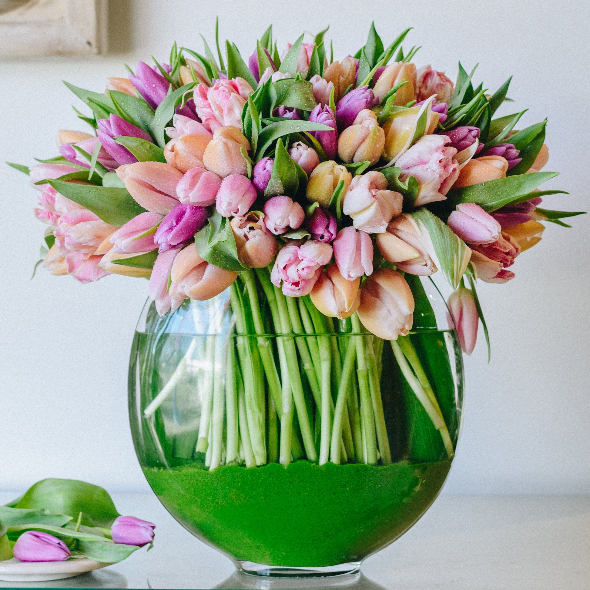 Vibrant and sweet, this refreshing new design features a rainbow of up to 60 pastel pink, peach, and lavender Dutch tulips. The exposed stems meet bright green decorative sand, all submerged within the 10" tall glass fish-eye bowl. This stunning arrangement stands at approximately 18" tall overall.