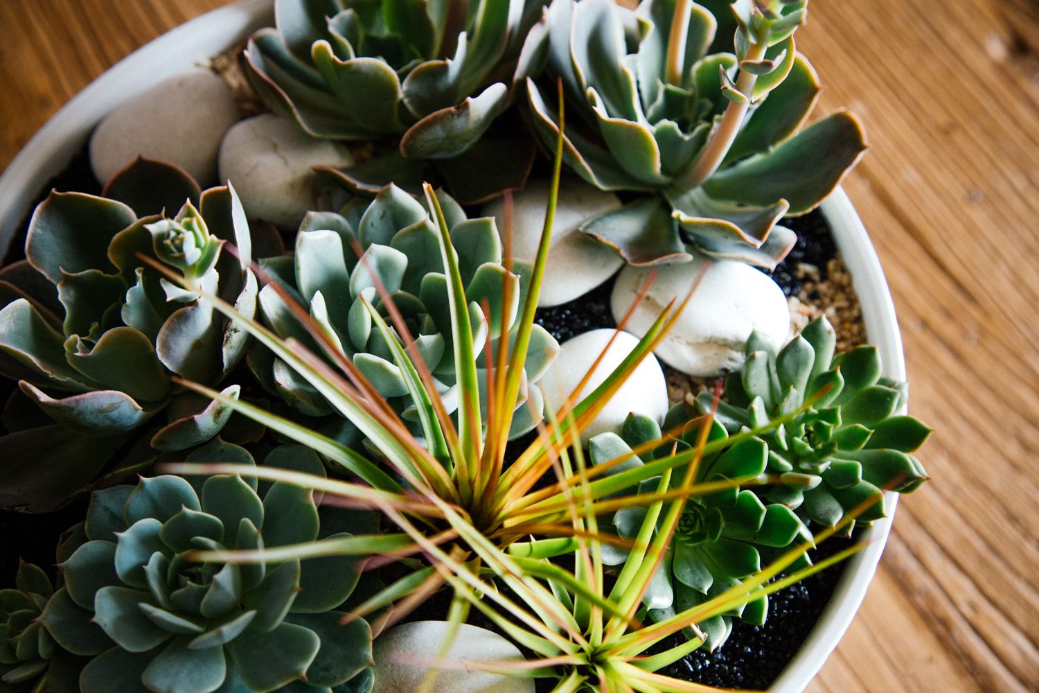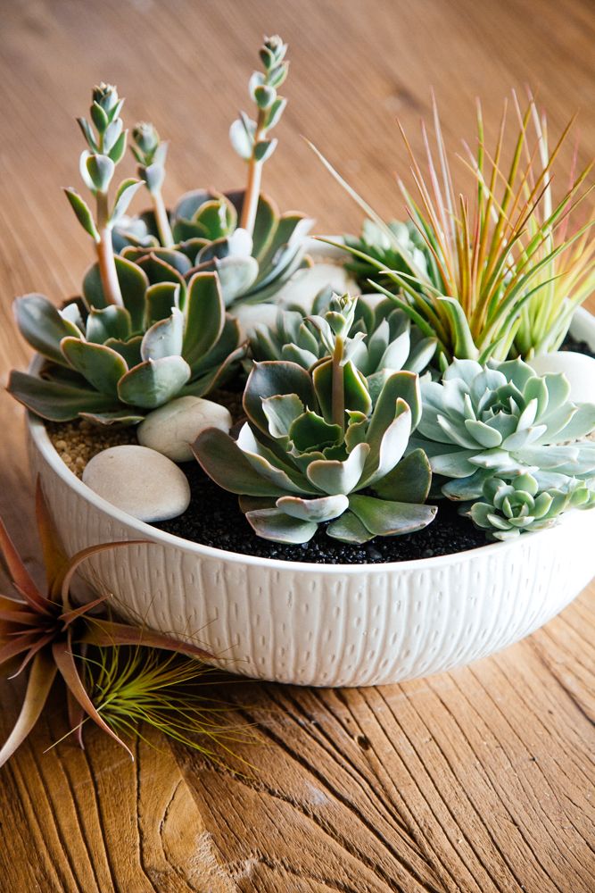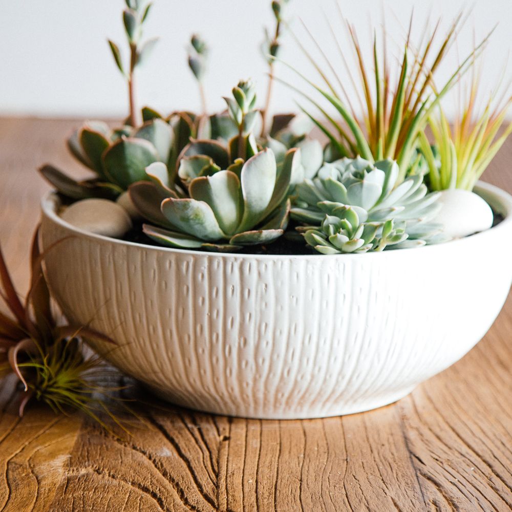 Lush green succulents and air plants are placed amongst smooth river stone, creating a peaceful riverbed effect. Resting atop black and brown pebbles, this arrangement sits inside a 5” by 12” white ceramic vase. Overall this arrangement stands around 12” tall.
