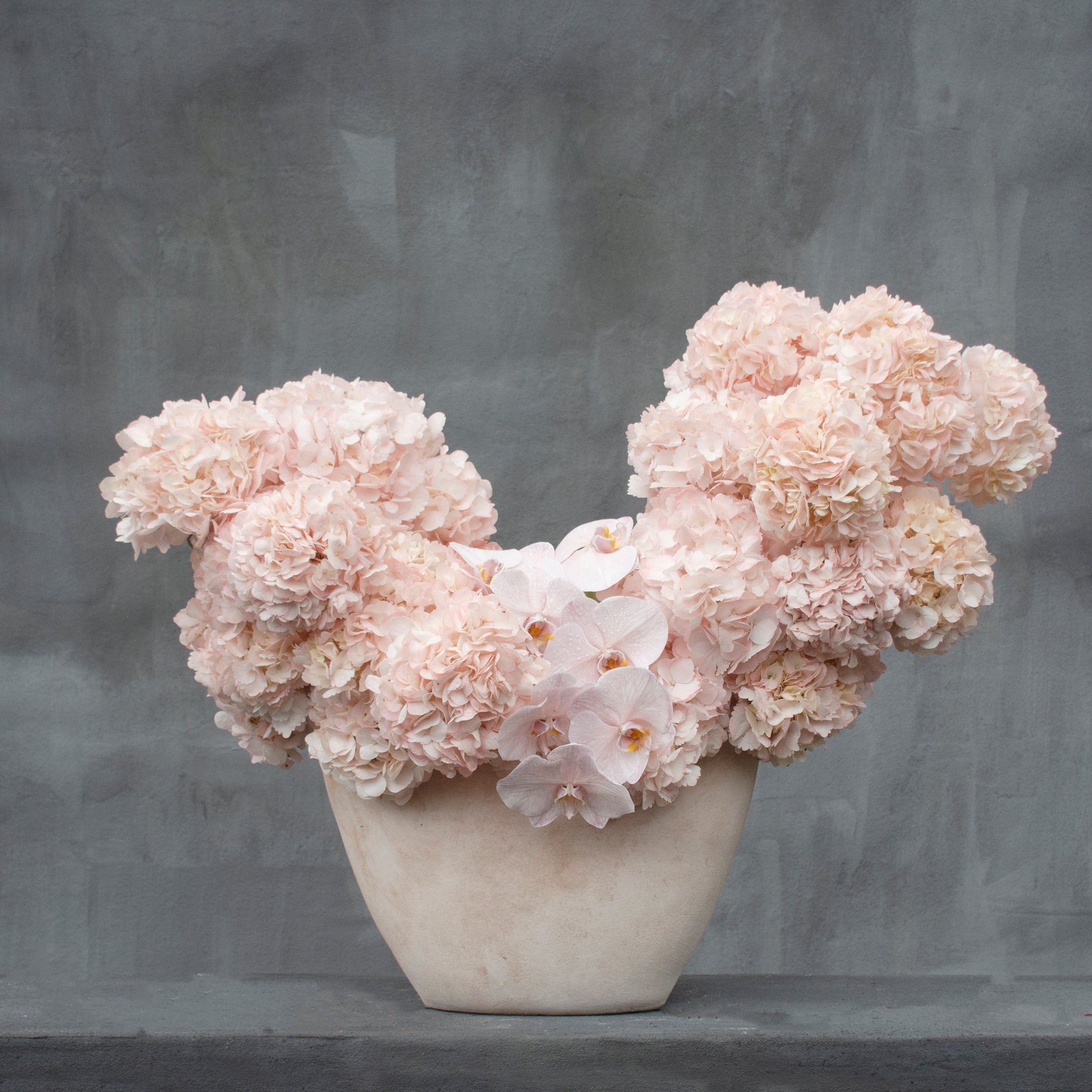 A dream in blush, Rosé Reverie is an exquisite floral sculpture that blends softness with structure. Billowing clusters of blush pink hydrangeas create a cloud-like silhouette, their ruffled petals evoking a sense of romance and ethereal beauty. Nestled within, delicate chocolate Phalaenopsis orchids emerge like whispered secrets, their velvety petals unfurling in muted ivory and warm cocoa hues. Cradled in a subtly textured off-white vase with warm, sun-kissed brown undertones, this arrangement embodies effortless sophistication. Its sculptural design and pastel palette make it a statement of refined luxury