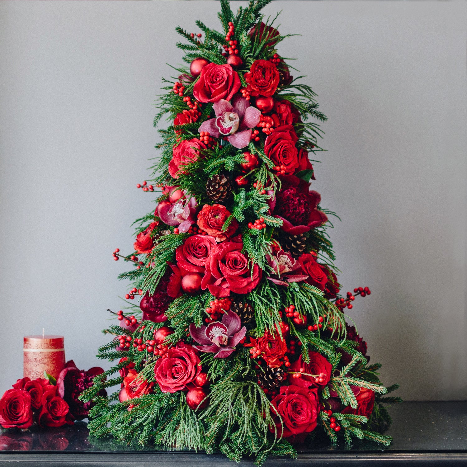 As full with red roses as this vibrant topiary cone may be, the deeply burgundy peonies, delicate red ranunculus, and red cymbidium blooms that also grace the 24" frame can't be missed! This "tree" design features micro pine, armadillo pine, and an abundance of pinecones for the full feel of Christmas.