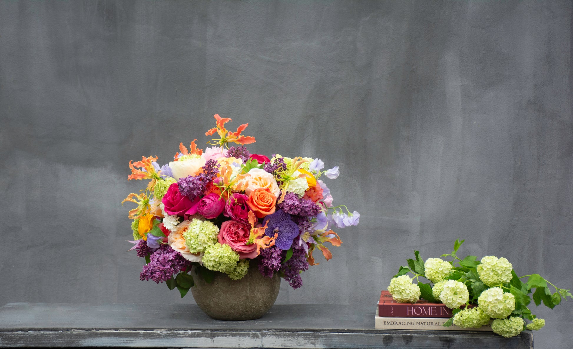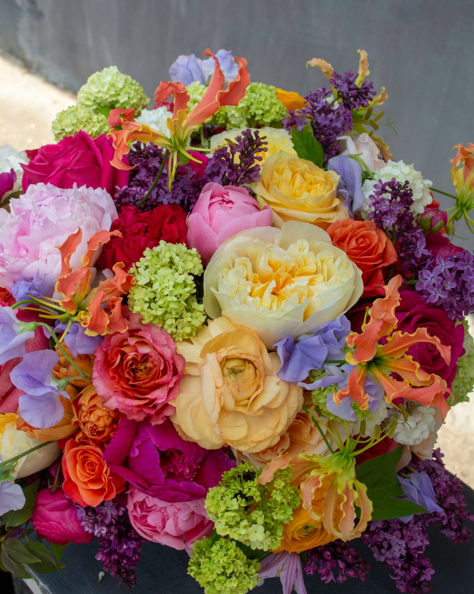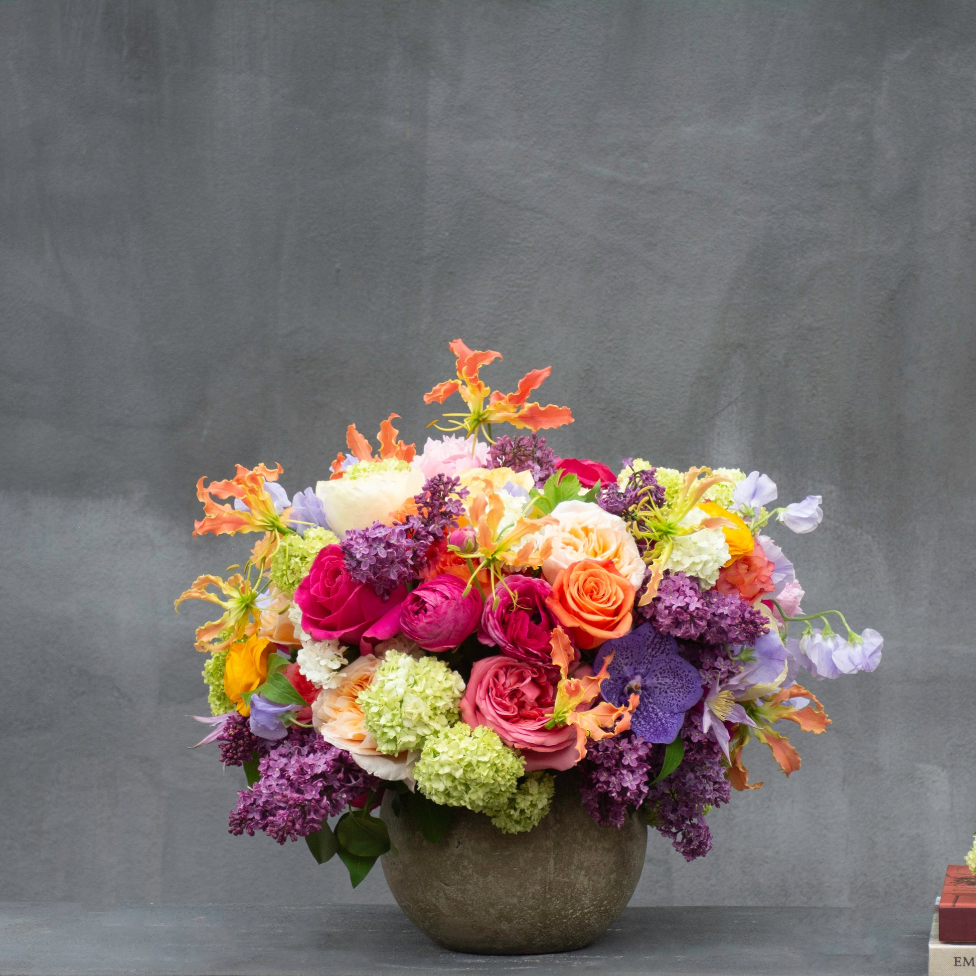 A captivating fusion of rich tones and spring freshness comes together seamlessly in Royal Embers. This design features a striking composition of blooms that include vibrant pink and peachy-apricot roses, deep purple Vanda Orchids, sprigs of Lilac, vibrant Viburnum, striking orange Gloriosa, carefree climbing Clematis, lush Ranunculus, and sudden pops of creamy garden Roses and light lavender Sweet Peas. All embraced in a custom-made stoneware 8-inch cylinder vase, this arrangement stands at approximately 14 inches tall and 12 inches wide.