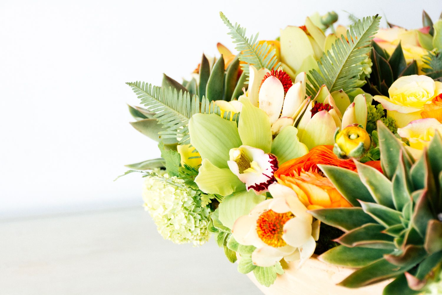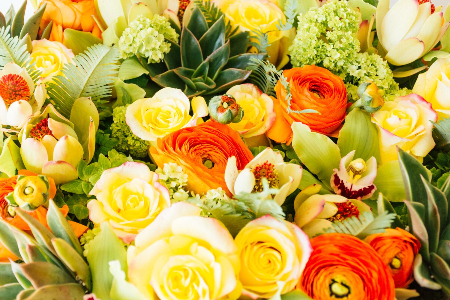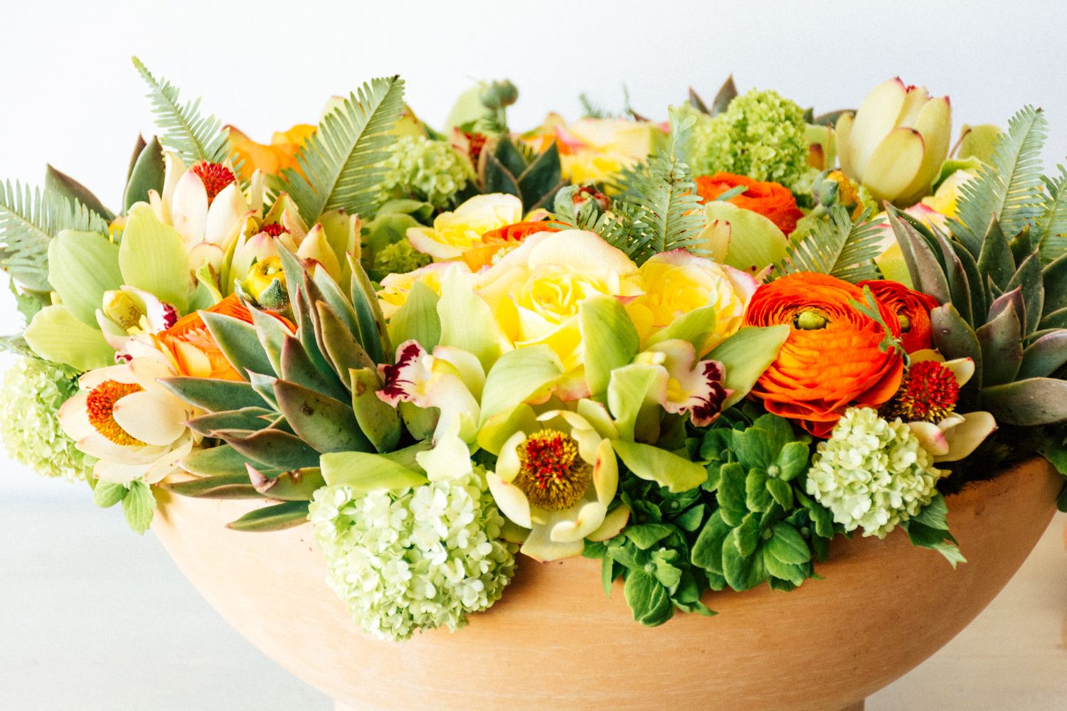 Cymbidium, Hydrangea, Protea, Ranunculus, Rose, Succulent, Sunset Safari Protea, Viburnum