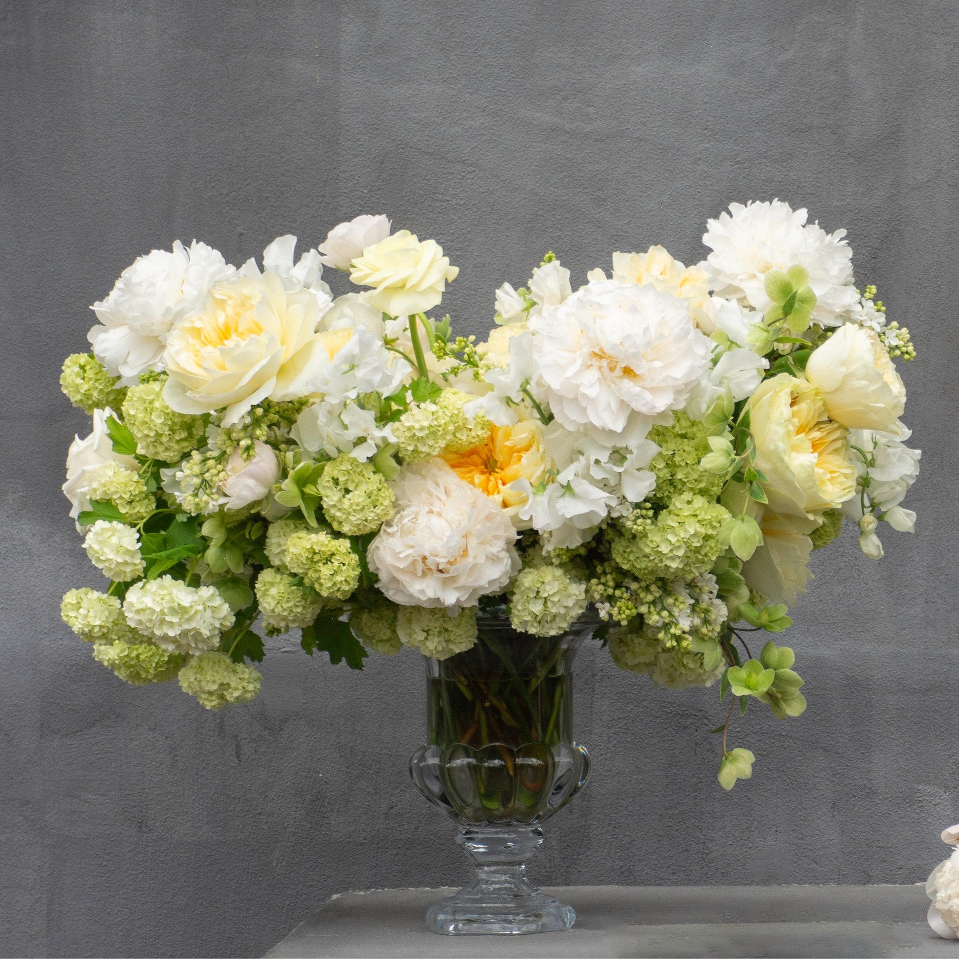 A composition of quiet grandeur, Soft Symphony is a study in light and texture—where creamy whites, whispering greens, and golden undertones unfold like a dream. Featuring buttery garden roses, white lisianthus, sweet peas and a scattering of white ranunculus. White lilac threads through the arrangement with its soft, fragrant clusters. Anchoring the piece are airy spheres of chartreuse viburnum, lending contrast and volume.