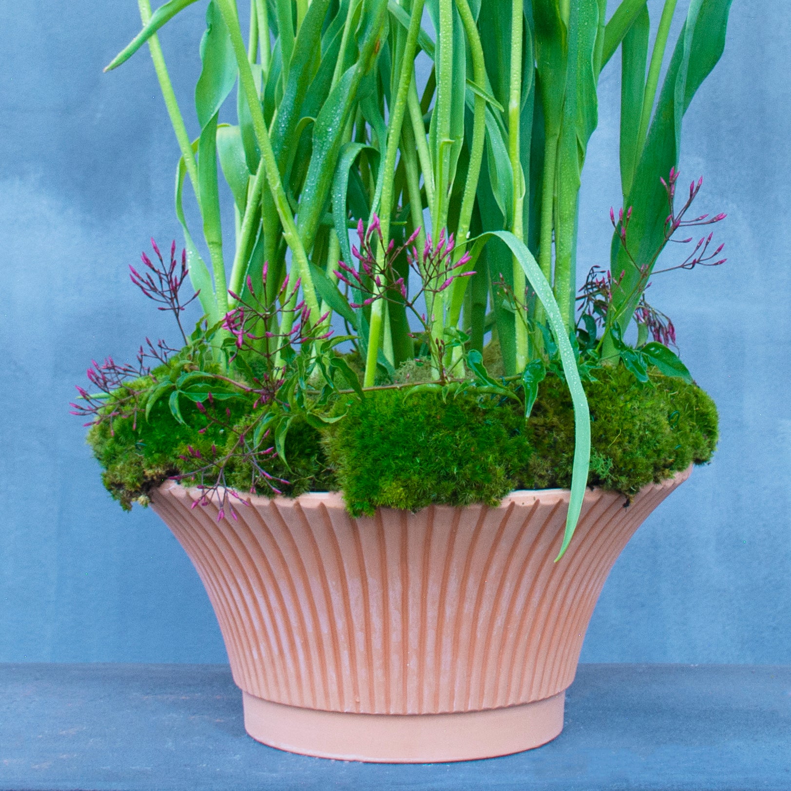 Sonnet in Spring is a composition of contrast and grace. French tulips, bold and reaching, rise from a soft bed of mood moss, their vivid hues dancing in the light. Jasmine leaves twine delicately around the arrangement, weaving whispers of romance and refinement. All cradled in a warm terra cotta vase, grounding the piece with rustic charm. A statement of effortless sophistication, designed to enchant.