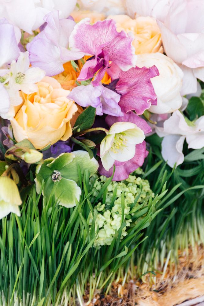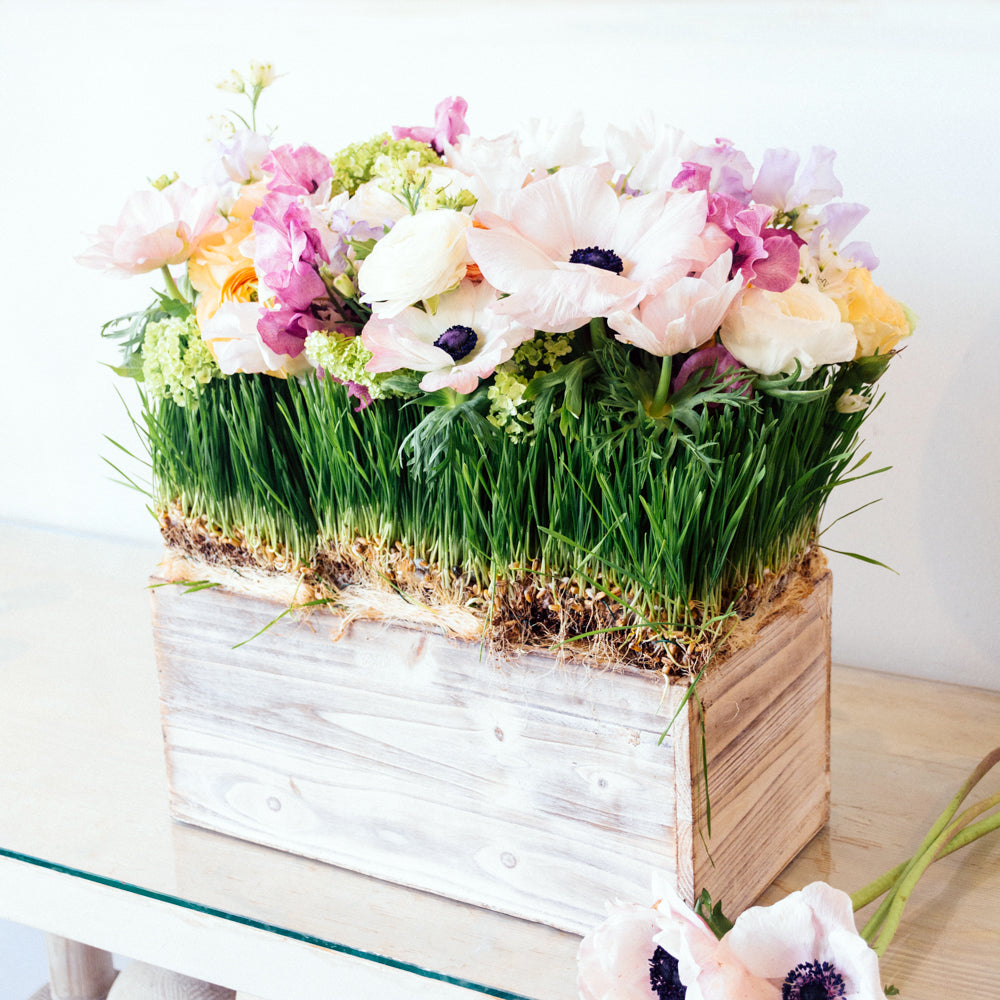 This fresh spring design invites the beauty of the hillside garden straight into your home. A pastel medley of roses, ranunculus, anemones, viburnum, and sweet peas appear as if growing atop a bed of wheat grass. This nature-filled design rests within a light wash wooden box measuring 13.5" long, with the design measuring approximately 15" tall overall.