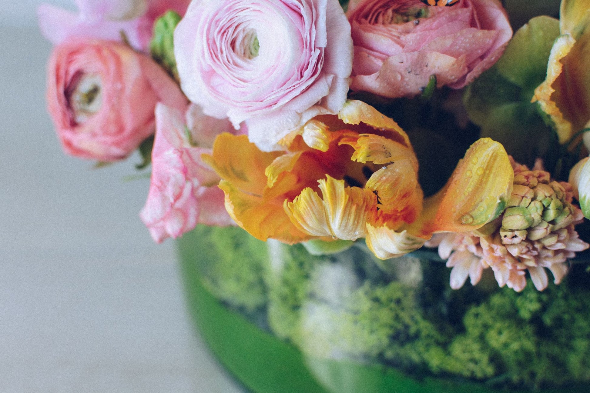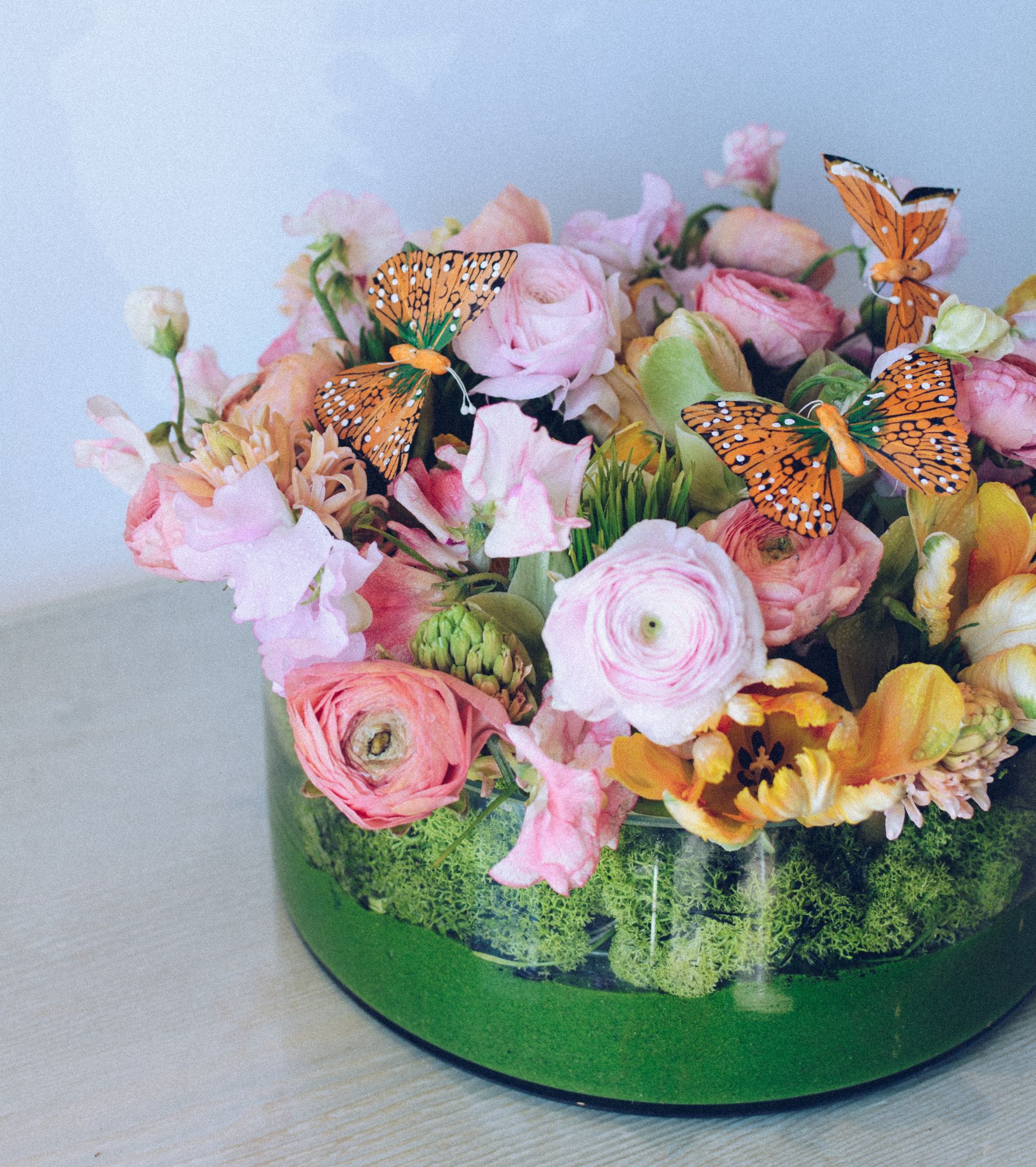 Moss, Ranunculus, Reindeer Moss, Sweet Peas, Tulip