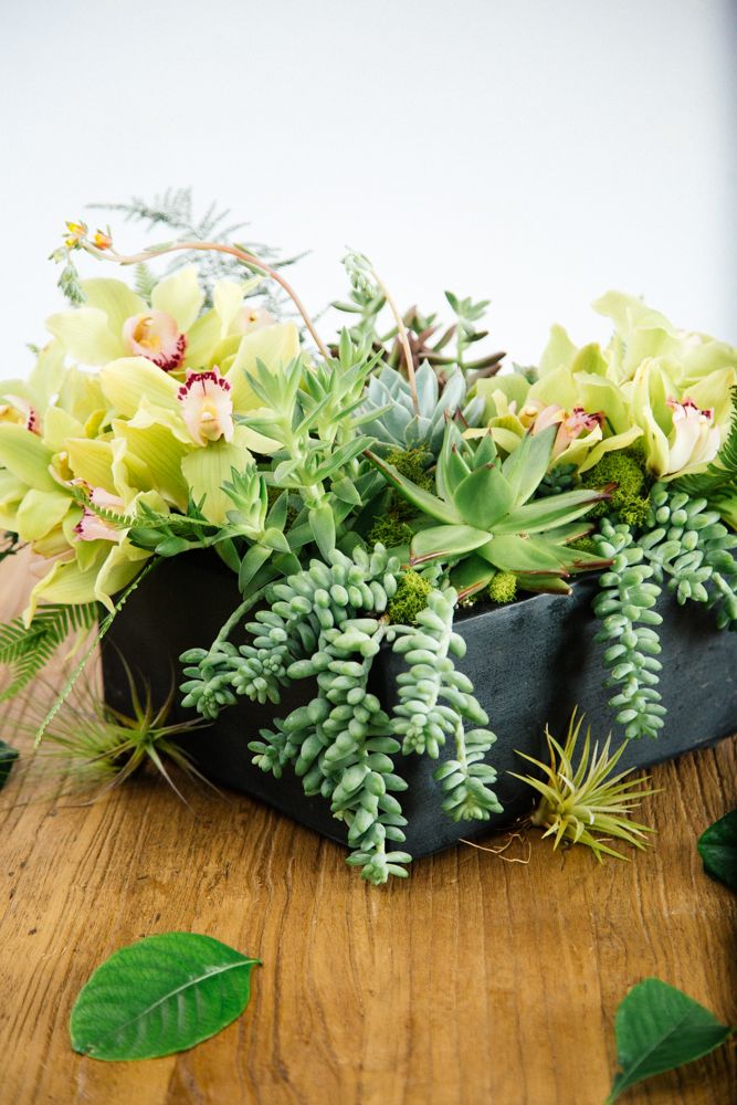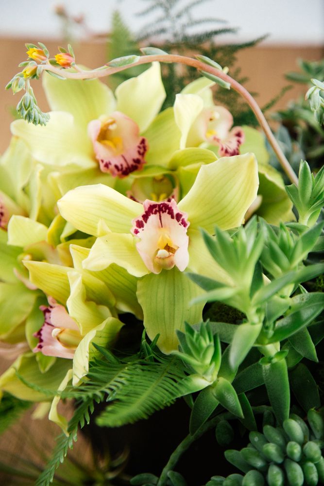 Lush green cymbidium orchids are accented by vibrant green reindeer moss and fern. Fresh green succulents add the final perfect touch. Resting inside a 5” by 10” black vase, overall this arrangement stands around 10” tall and 13” wide.