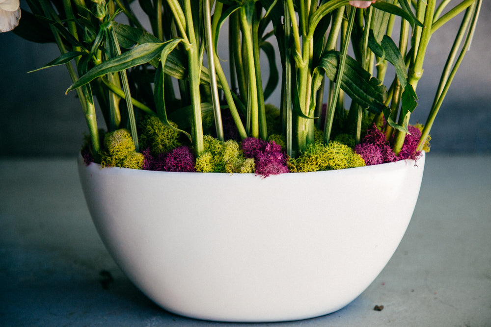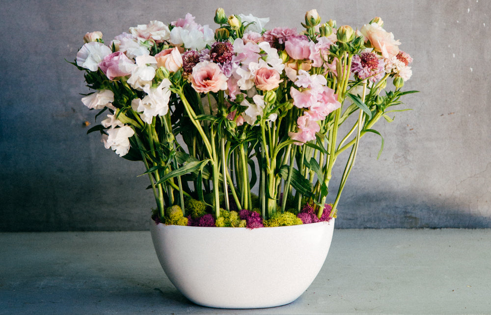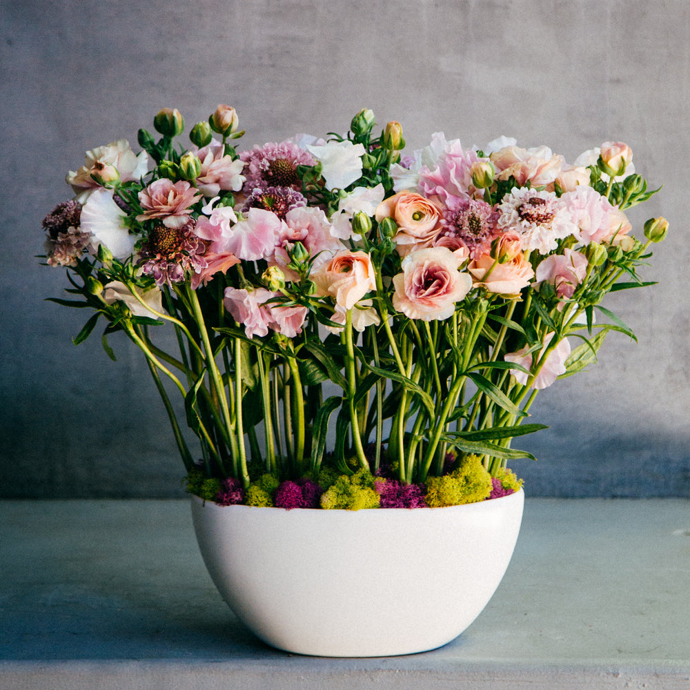 Butterfly Ranunclus, Lisianthus, Moss, Ranunculus, Reindeer Moss, Scabiosa, Sweet Peas