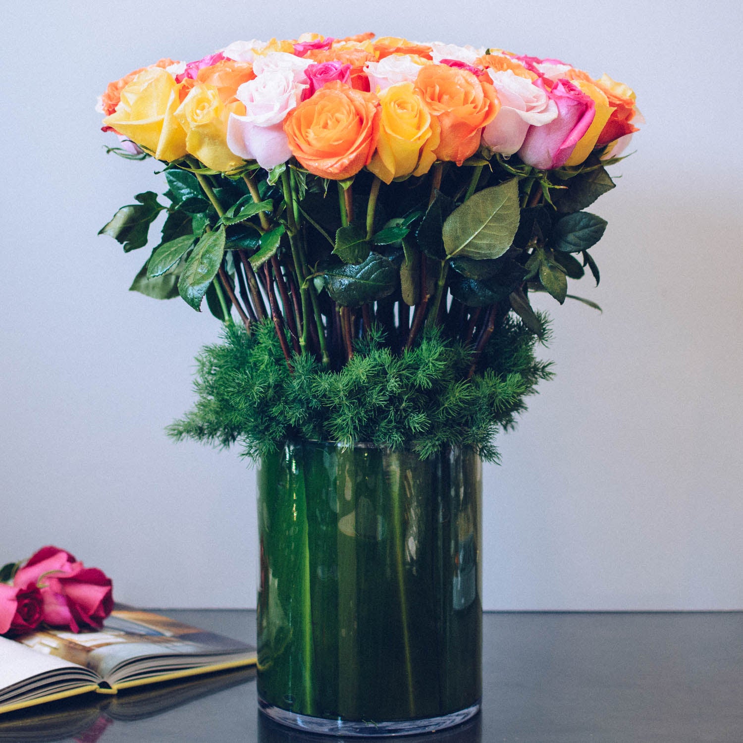 75 ROSES in a cylinder glass vase lined with palms leaves. The vase measures approx. 8" x 12" and the overall height of the arrangement is approx. 26".