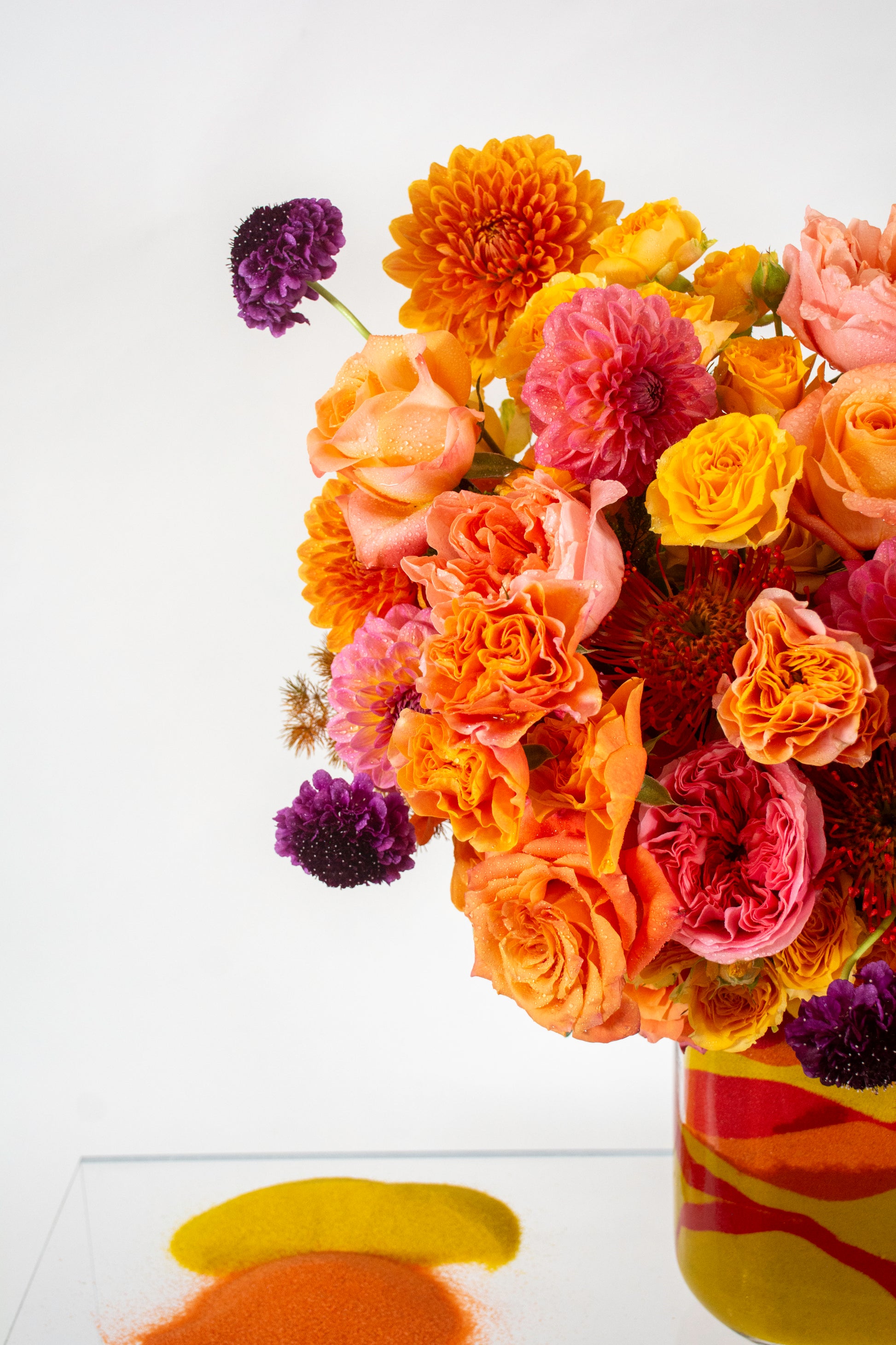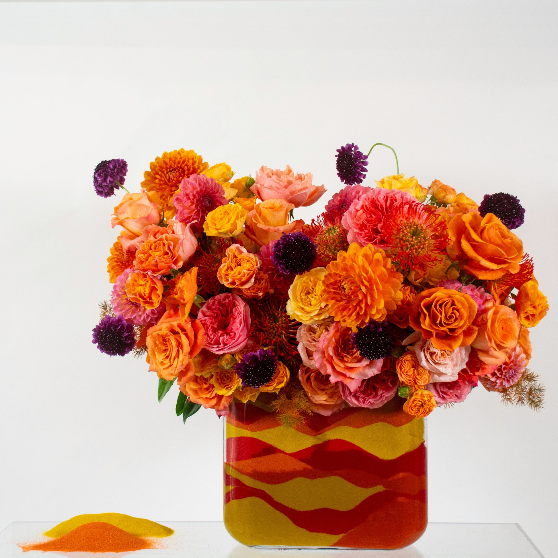 Sunburst radiates pure joy with its vibrant tapestry of orange Dahlias, soft pink and golden Roses, coral-orange and pink Garden Roses, yellow Spray Roses, and red-orange Pincushion Protea, along with pops of deep purple Scabiosa blooms adding dramatic contrast like jeweled accents.