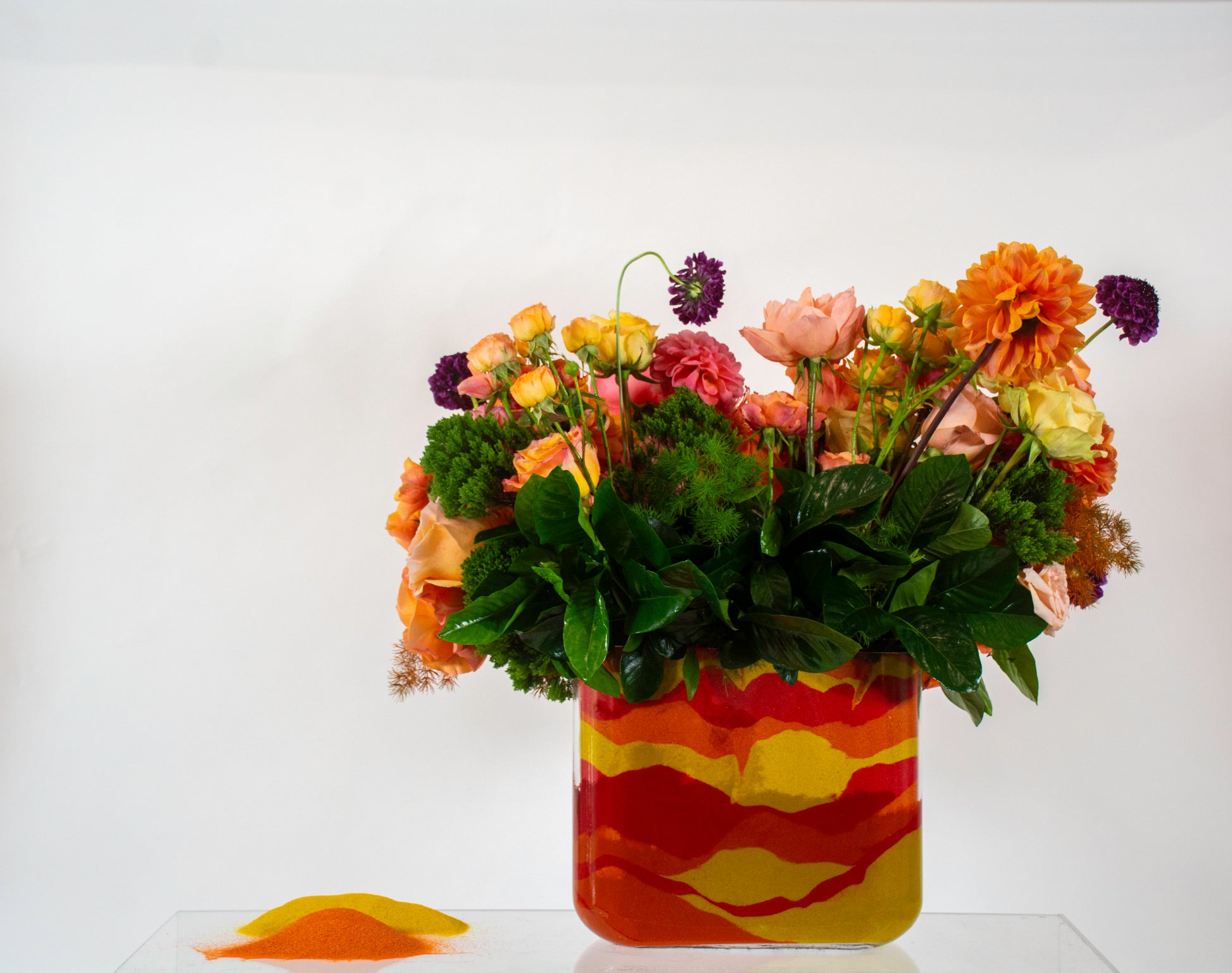 The arrangement's fiery palette is perfectly complemented by a glass vessel measuring approximately 10 inches in height, featuring layered yellow and orange sand in a striking pattern. This luminous composition captures the essence of pure sunshine, bringing warmth and energy to any space it brightens.