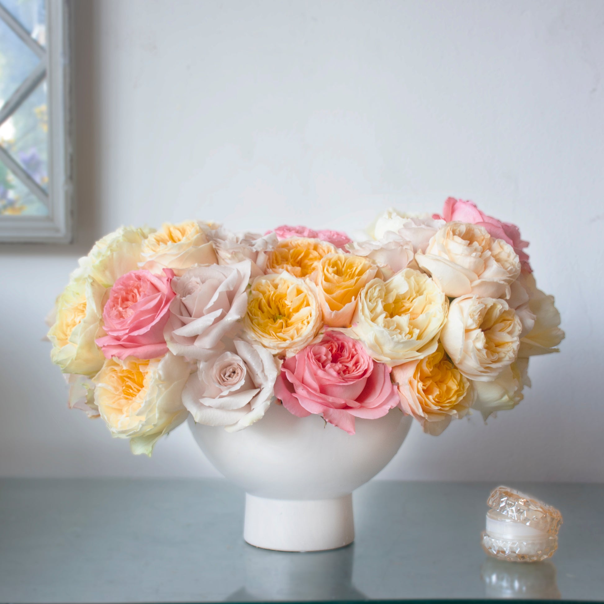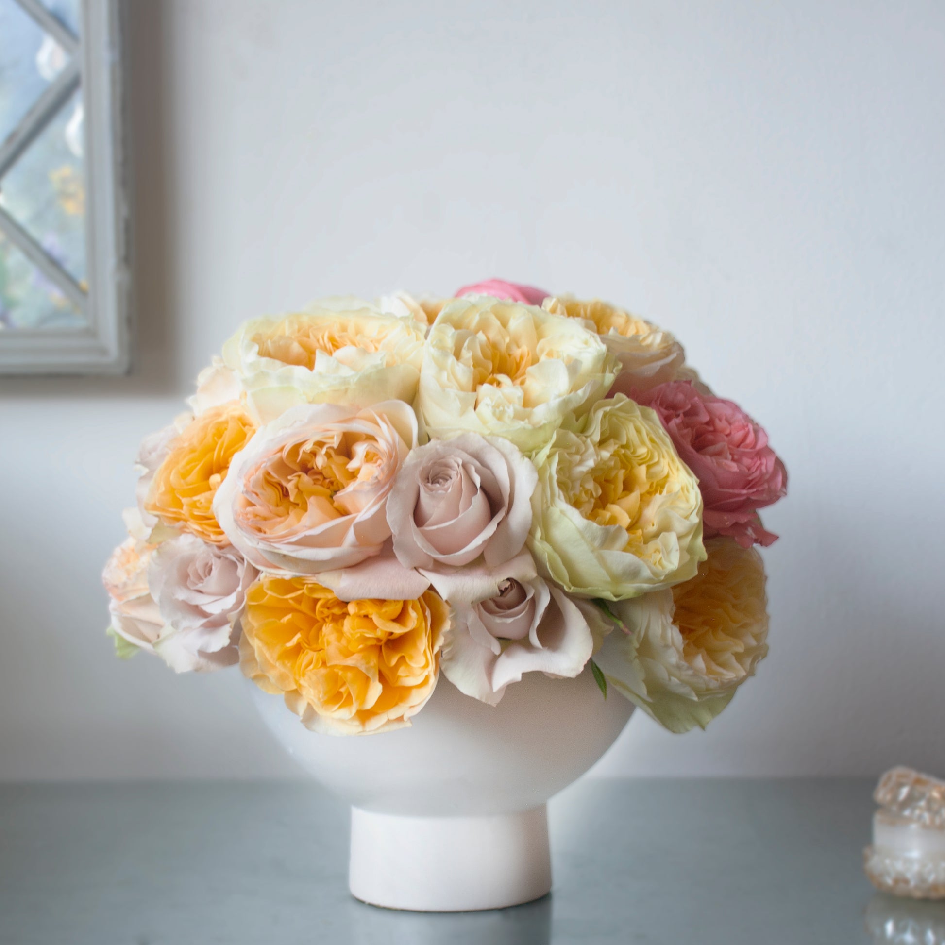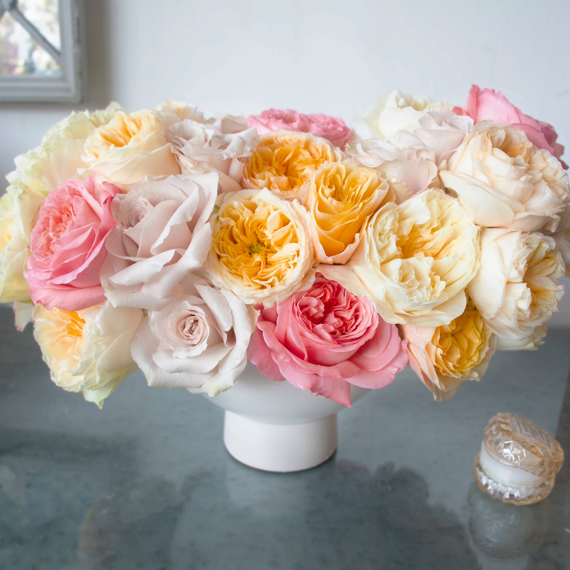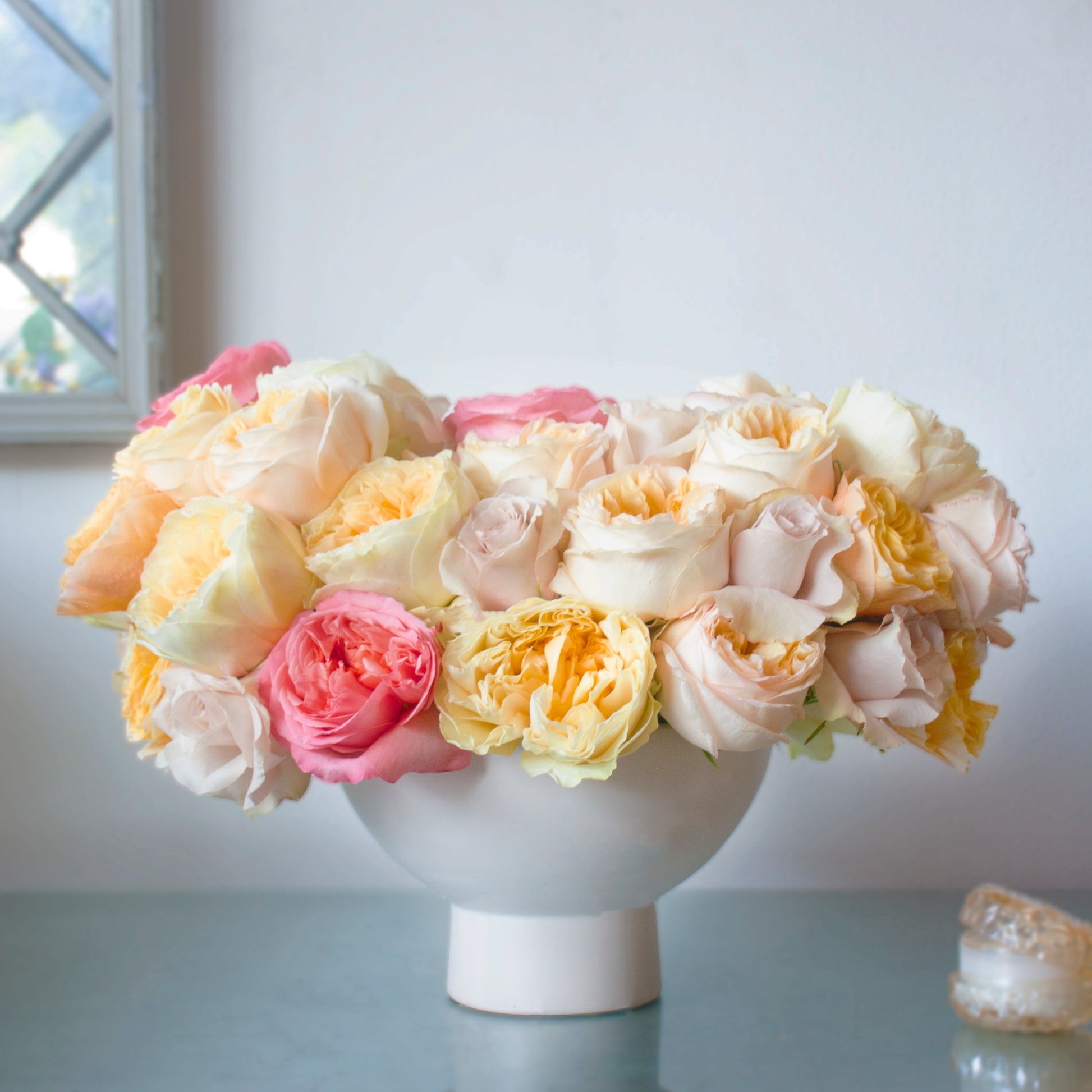 Immerse yourself in the beauty of a Sunrise Blush with this exquisite rose medley. Cheerful yellow garden roses nestle alongside soft quicksand roses, while delicate pink blooms add a striking touch of color. Elegantly arranged in a white pedestal vase, this bouquet spans 18 inches wide and stands 13 inches tall.