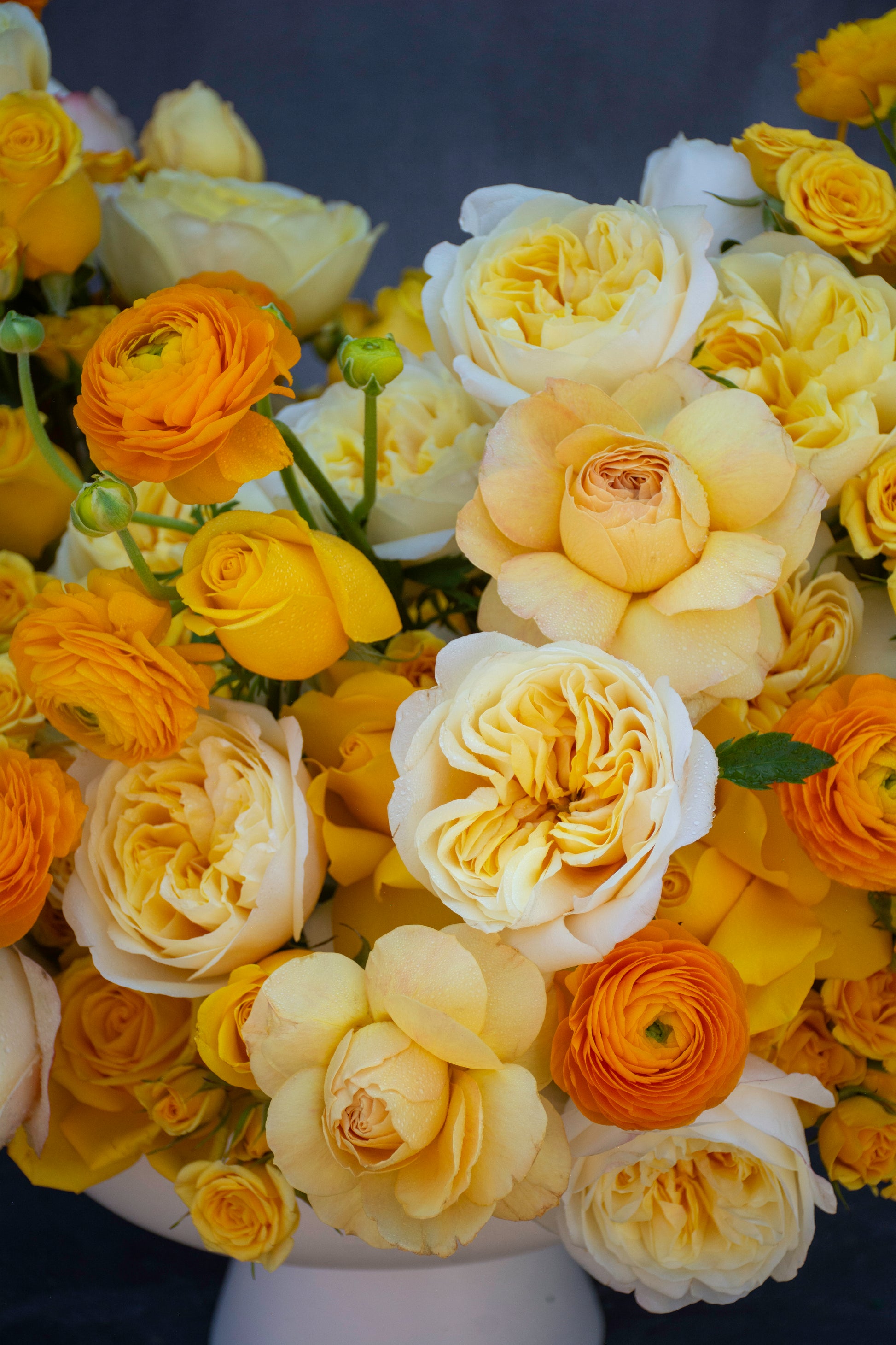 Sunset in Malibu captures the magic of those golden coastal evenings where the ocean embraces the sun, and daylight gracefully surrenders to dusk in brilliant washes of amber and coral. This enchanting arrangement brings that serene beauty indoors with sumptuous, butter-soft Garden Roses in rich yellow tones, vibrant sunshine Roses, cheerful bursts of flame-orange Ranunculus, and delicate peachy-orange Spray Roses.