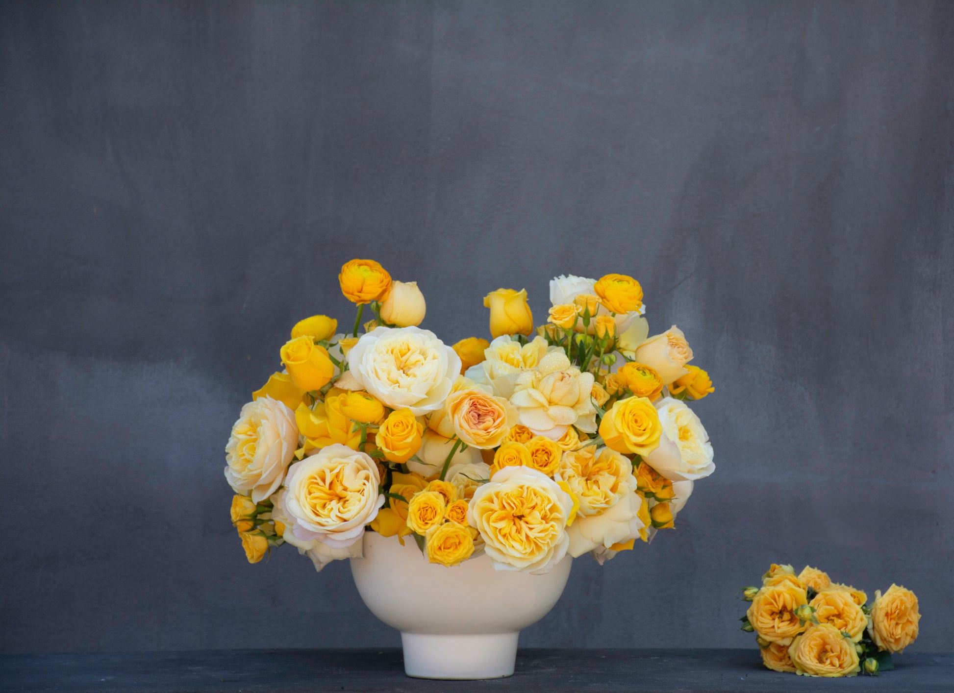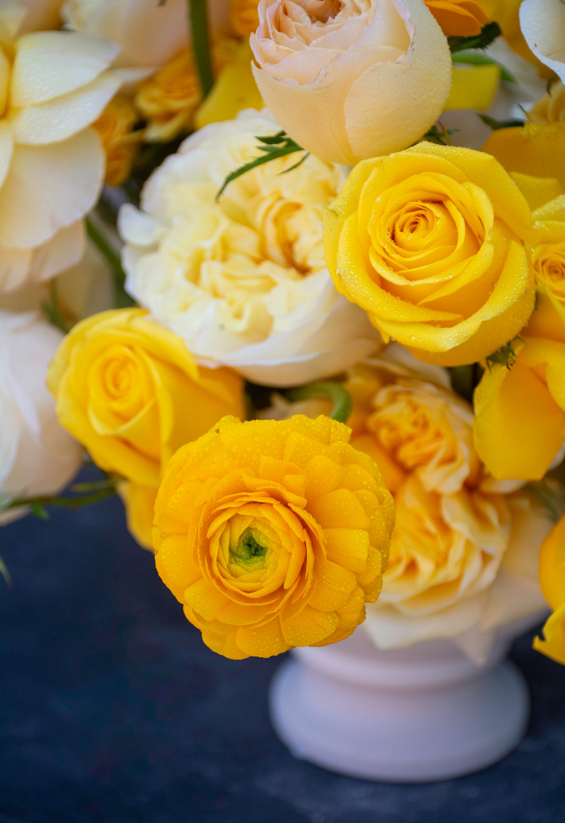 Each bloom carefully held together in white pedestal vases tell the story of those perfect Malibu moments when time seems to pause and the world is painted in pure warmth. Don't be surprised if you find yourself pausing to smile whenever you pass this radiant design—that lingering joy was exactly our intention.