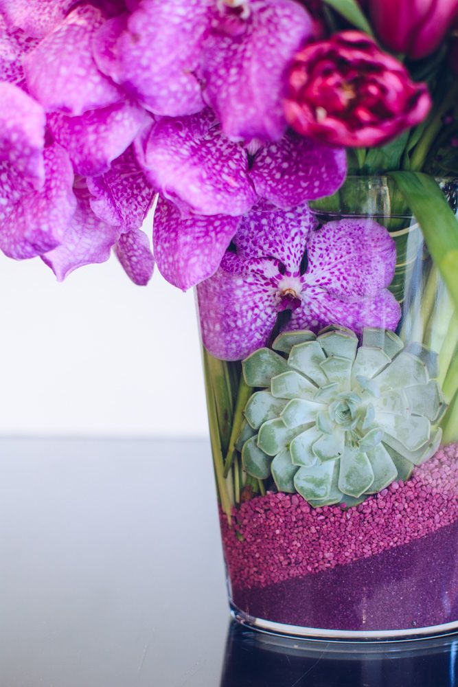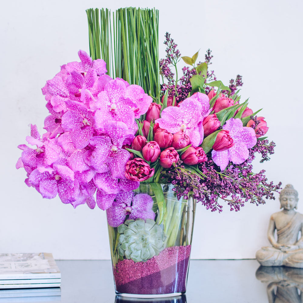 Bold and modern, this stunning design is the perfect statement piece for any room. Fuchsia tulips, vibrant vanda orchids, and bunches of lilac are artfully placed alongside steel grass for a structured finish. A single hand-selected succulent, stems of steel grass, magenta gravel, and decorative sand can be seen submerged within the 10" by 8" glass vase. Overall this contemporary arrangement stands at approximately 26' tall.